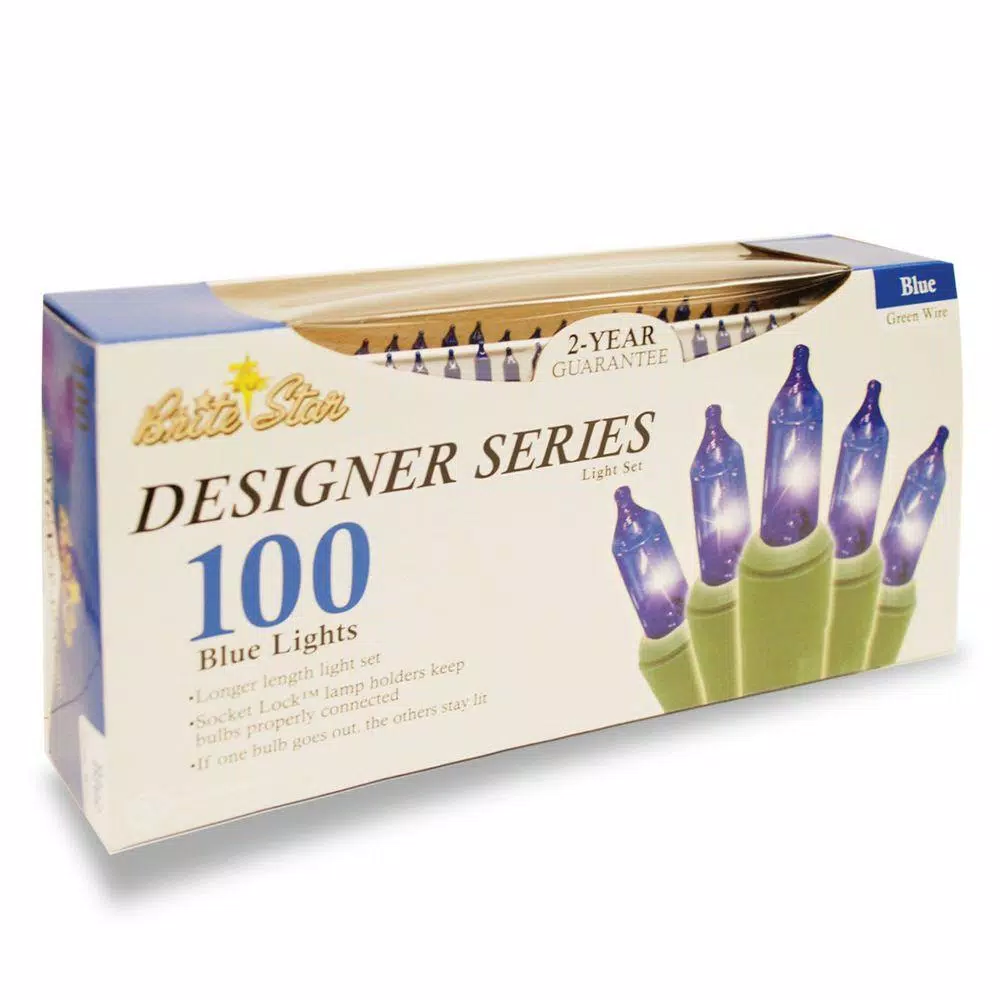 Each strand has 100 incandescent mini-bulbs on green wire to blend in with your Christmas tree or landscaping. 36.75 ft. strand includes 18 in. lead cord, 4.25 in. spacing between bulbs and 3.5 in. end cord. Light set features Socket Lock lamp holders, keeping bulbs secured in place. If one bulb should get loose, the others still remain lit. Each string has end-to-end connector for adding on light sets. Replacement bulbs and fuses included. Suitable for indoor and outdoor use, UL-listed, box of 2.