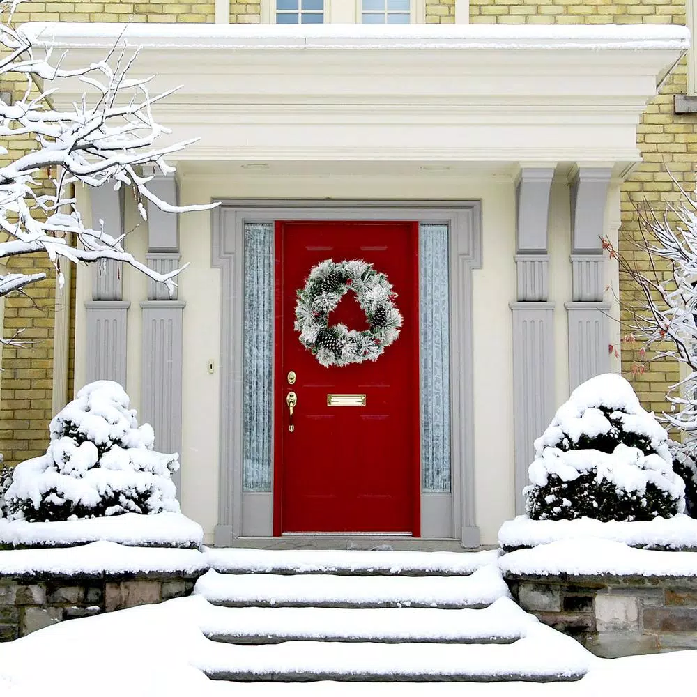 - Designer finishes: handcrafted snow flocked decor trimmed with festive pinecones and red berries, suitable for indoor or covered outdoor use