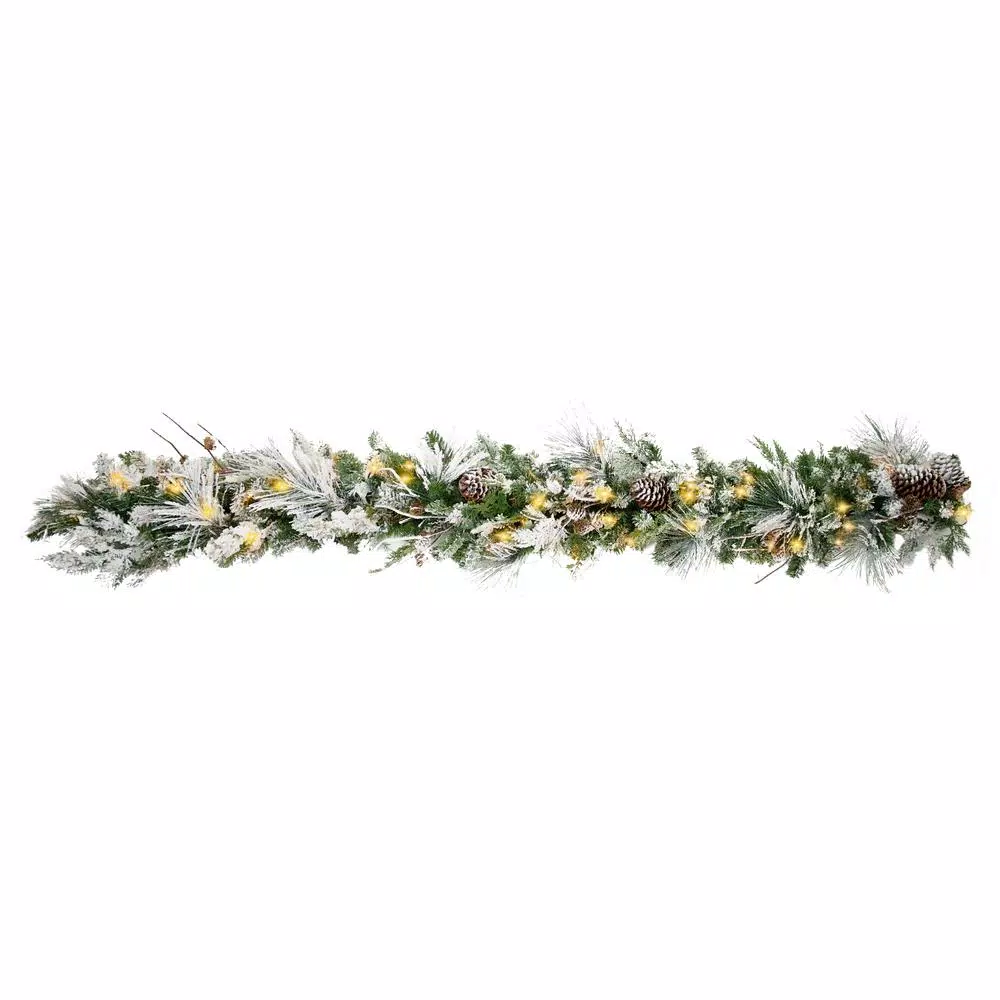 Beautiful down swept garland features a blend of flocked PVC greenery with white pine needles tips and real pinecones. Pre-lit with 60 warm white LED lights that are brighter than most has a built-in on/off switch and countdown timer that runs 6-hours. on/18 off. Requires 3 C batteries not included. Weather safe for indoors or out. Measures 14 in. Dia x 72 in. L, Weighs 4.1 lbs.