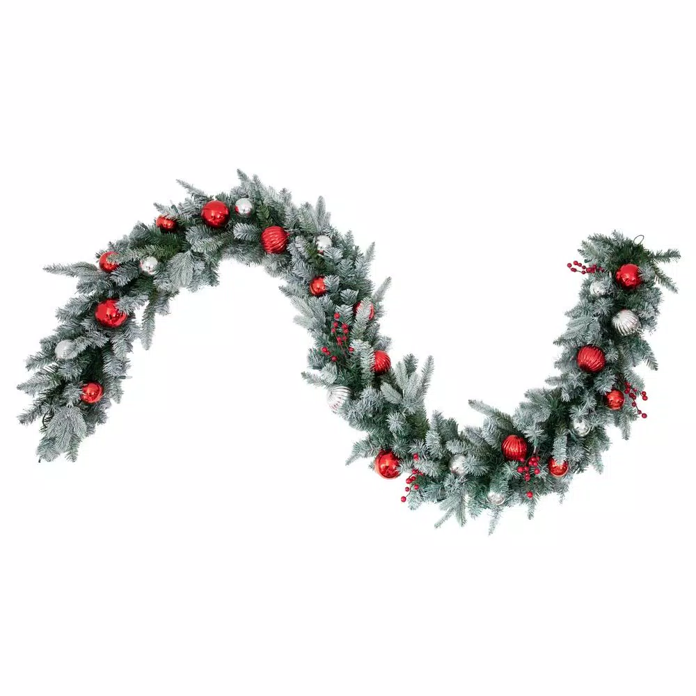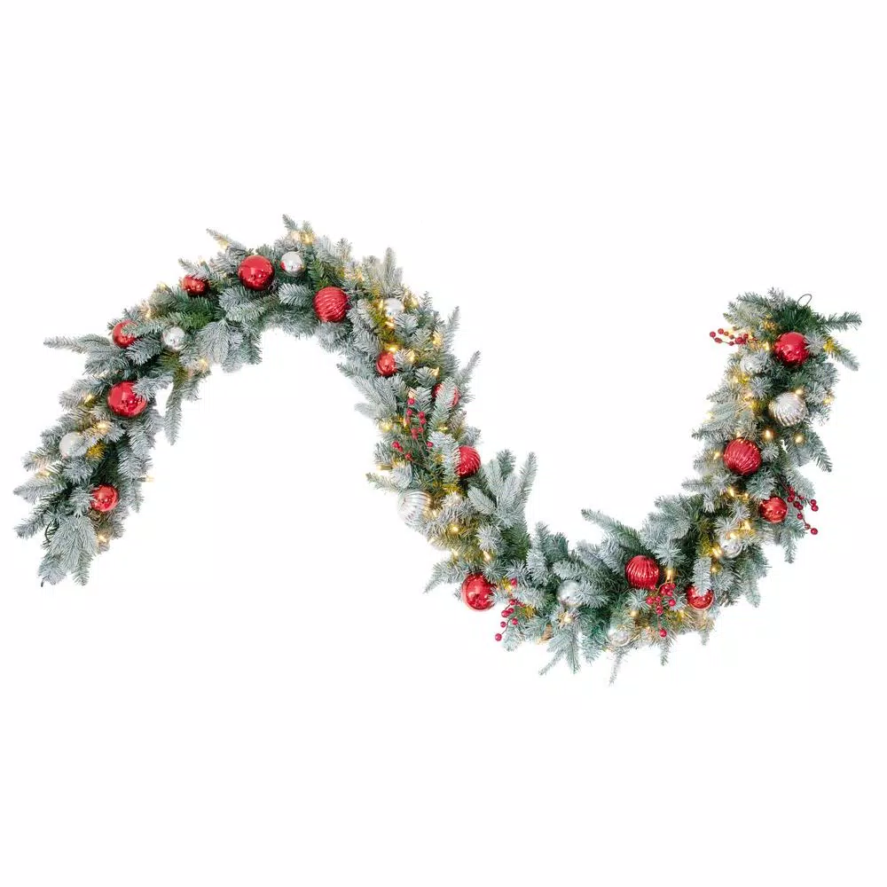 The Frosted Christmas Garland is full of snowy fun and charm. This Pre-lit 9 ft. L x 12 in. Dia Christmas garland is adorned with red and silver shatterproof ornaments, faux red berries and 240 snow tipped PVC mixed greenery. Pre-strung with 100 warm white LED lights that are brighter than most, has an end to end plug connection that allows you to connect multiple garlands together. Weather safe for indoors or out.