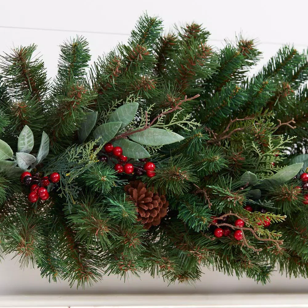 Brighten the holidays with this festive 17-ft. Woodmoore artificial Christmas garland. Crafted with cheerful pinecones, berries and ornaments, this elegant decoration has 310 PVC tips for a realistic look. The lovely red poinsettia blooms add a vibrant touch to your holiday decor. For indoor and covered outdoor use.