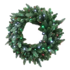 With a full and elegant shape, this 36 in. Pre-lit LED Artificial Royal Grand Spruce Wreath with Red and Green and Cool White is the perfect addition to your holiday décor. Each wreath features super bright micro-style LED in red, green and cool white. The realistic spruce tips add a unique holiday touch to your home.