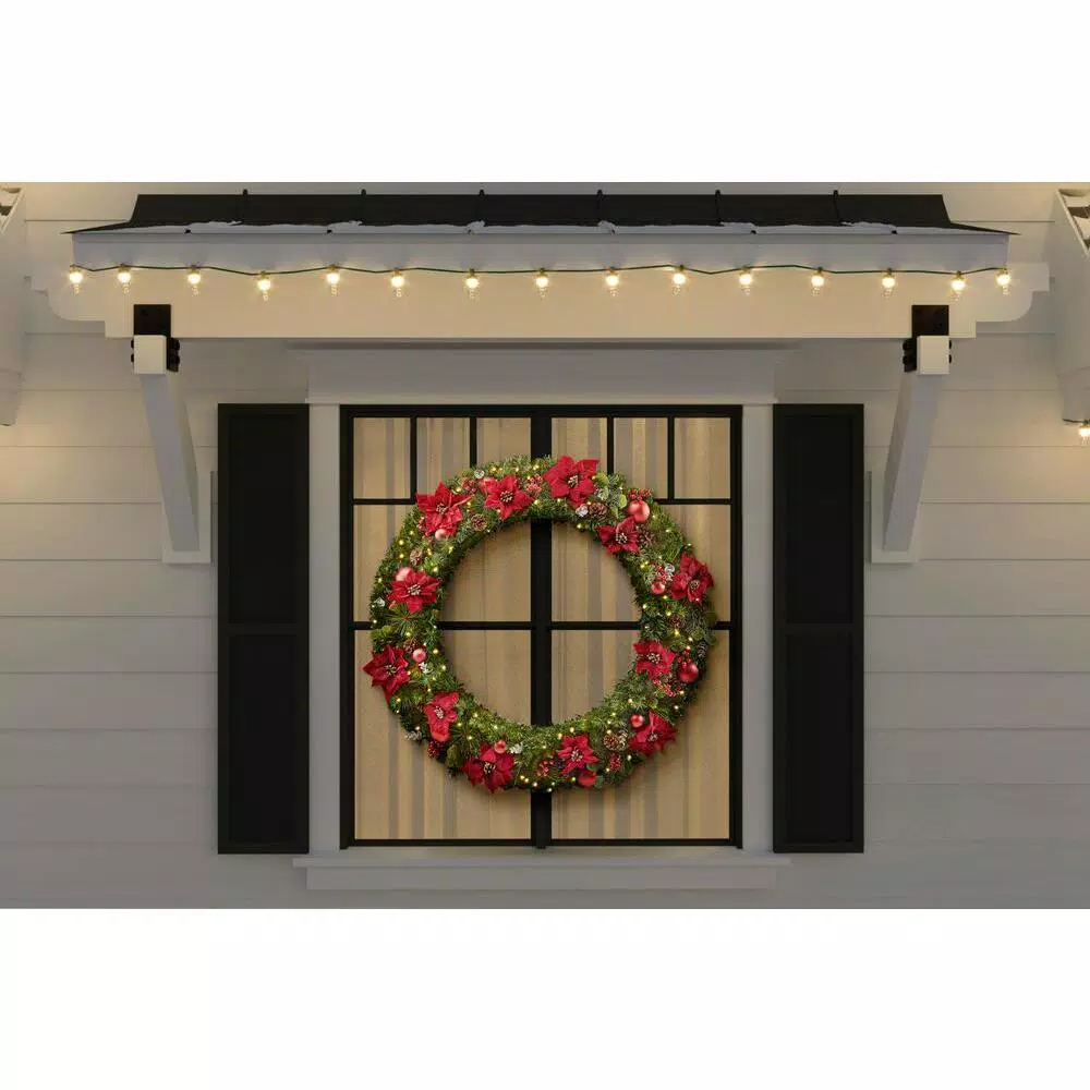 Add a cheerful glow to the holidays with this 48 in. Berry Bliss Artificial Christmas Wreath by Home Accent Holidays. Illuminated with 200 low voltage LED lights, the natural-looking wreath is perfect for above your fireplace or a stairway rail. Decked out with pine cones, berries and ornaments, vivid red poinsettia blooms give it a festive finishing touch. The long-lasting LED bulbs use up to 80% less energy than incandescent lighting. This pre-lit wreath is rated for indoor and outdoor covered use.