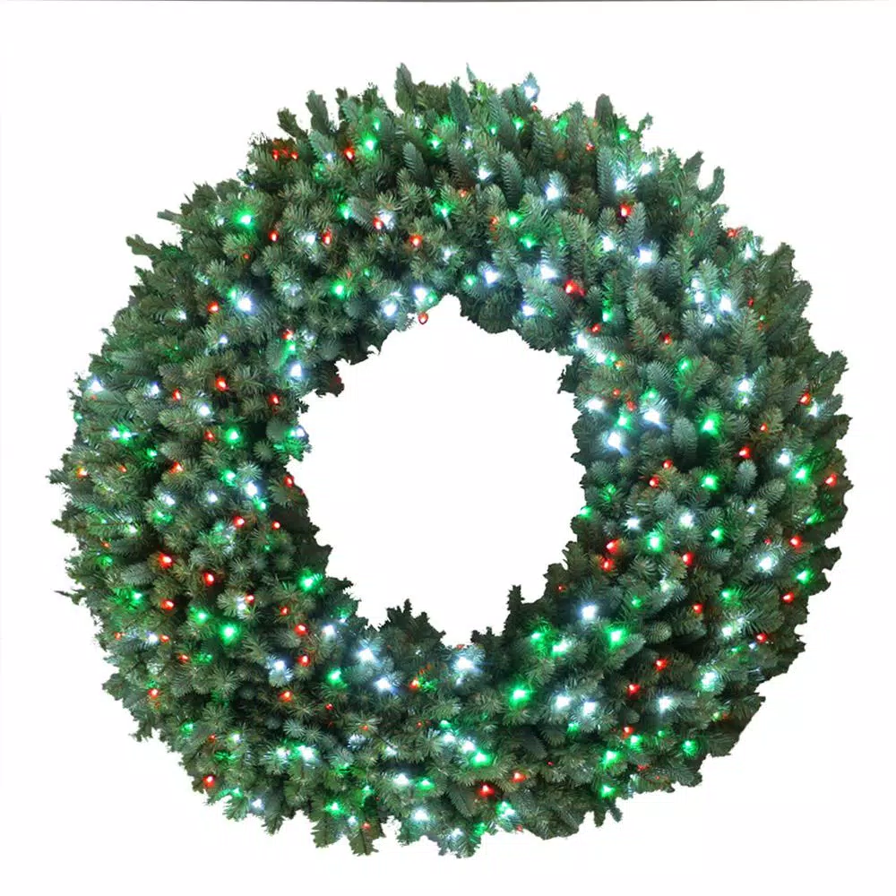 With a full and elegant shape, this 60 in. Royal Grand Spruce Artificial Wreath with Red/Green/ Cool White is the perfect addition to your holiday décor. Each wreath features super bright micro-style LED in red, green and cool white. The realistic spruce tips add a unique holiday touch to your home.