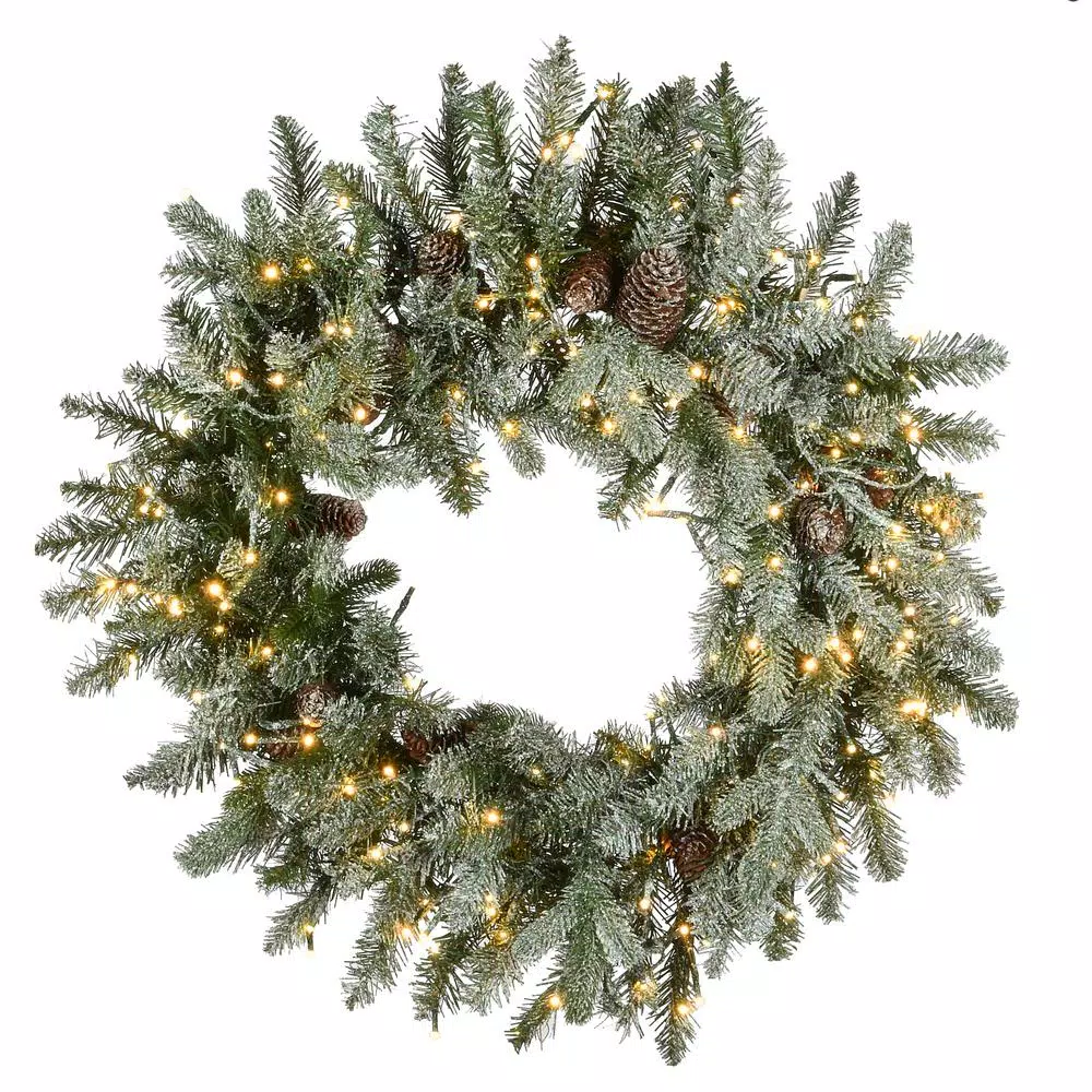 This Snowy Morgan Spruce wreath features Feel Real branch Tip technology, creating a decoration with remarkable realism. Sprinkled with snow and trimmed with pine cones, this wreath is pre-strung with 200 Cosmic Lights which are micro LED bulbs pre-strung at 4-times the volume found on wreaths of comparable size. The integrated Dual Color system features a choice of 10 different warm white and multicolor light functions. This wreath can be displayed on doors, walls and windows in indoor or covered outdoor locations.