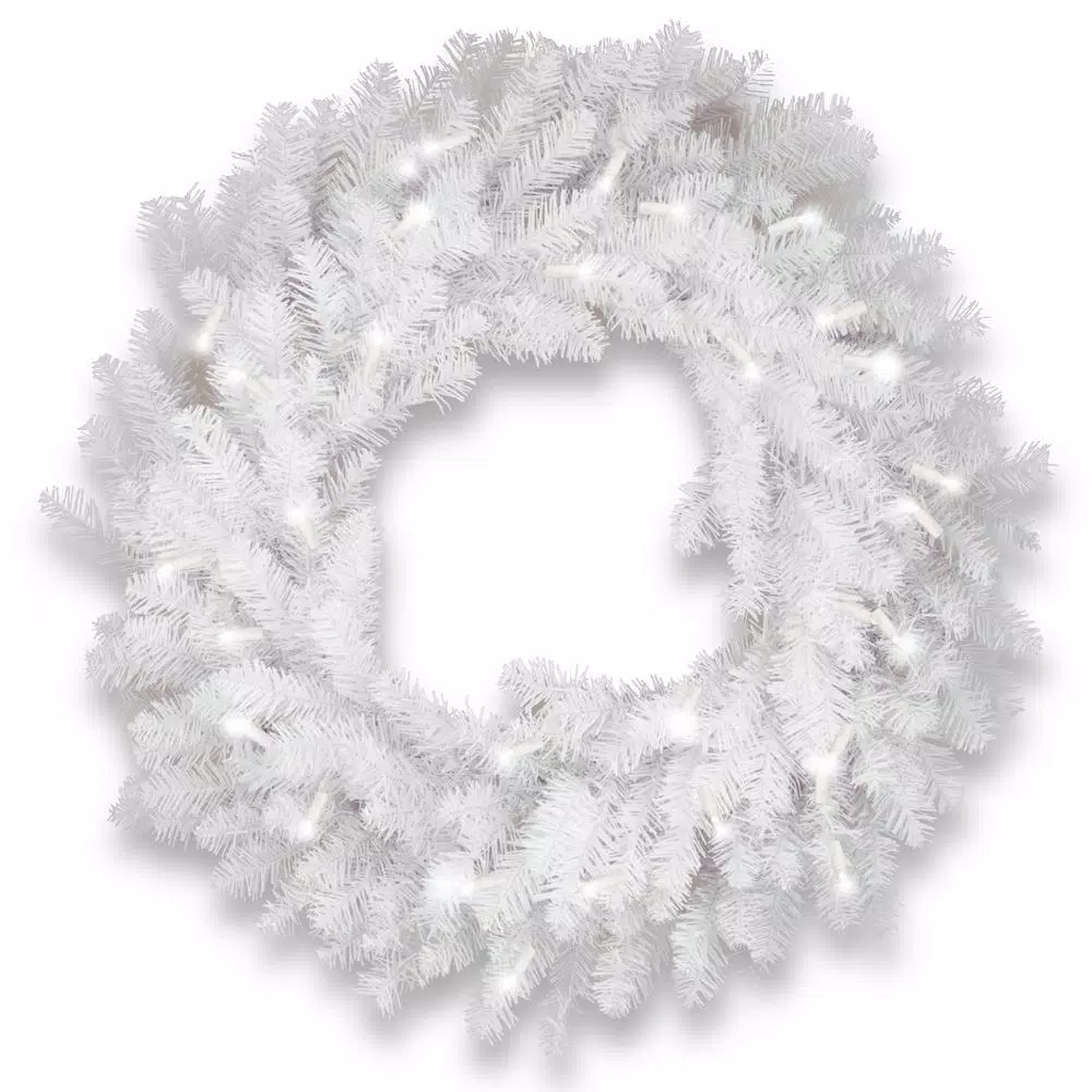 The Dunhill White Fir is an attractive alternative to the traditional green holiday decoration. It is pre-strung with 50 clear lights that remain lit even if a bulb burns out. Personalize your wreath by adding berries, holly, cones or other deco found at local craft stores. This wreath can be displayed on doors, walls and windows in indoor or outdoor locations.