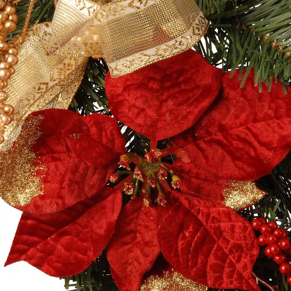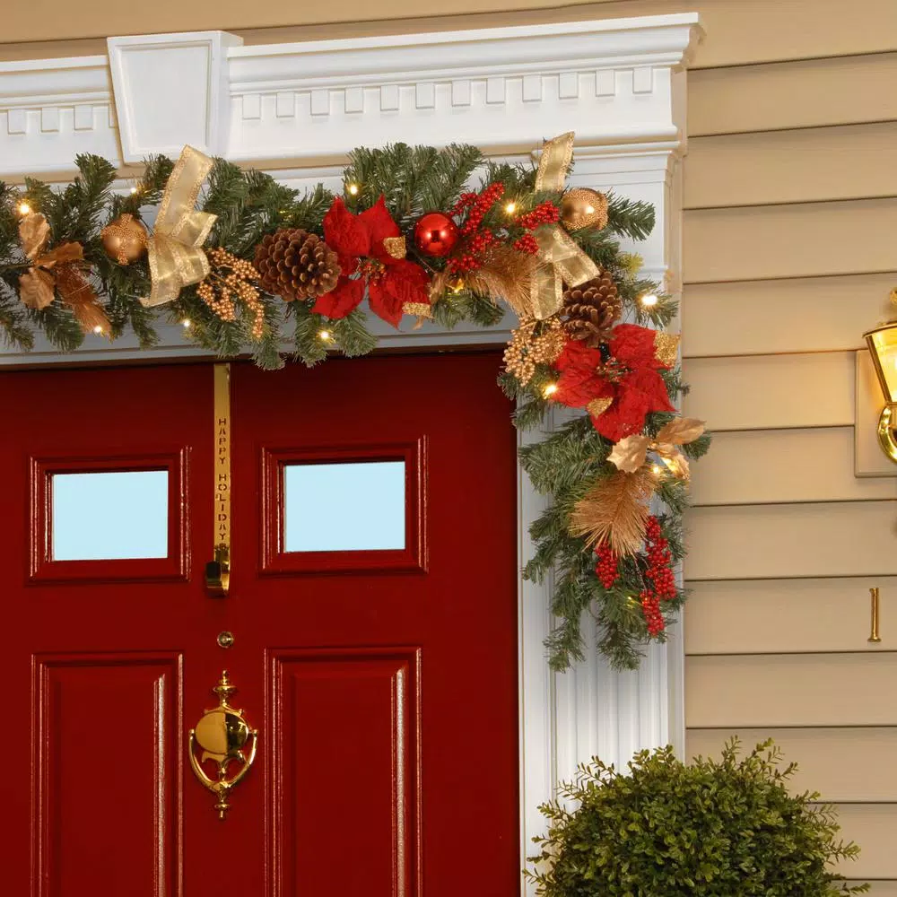 This evergreen garland with mixed branch tips features an assortment of decorative holiday embellishments. It is trimmed with pinecones, holly leaves, poinsettia flowers, berry clusters, lace bows and ball ornaments. This flexible garland can be displayed over doors, windows, fireplace mantels, fence, or stairway railings in indoor or covered outdoor locations.