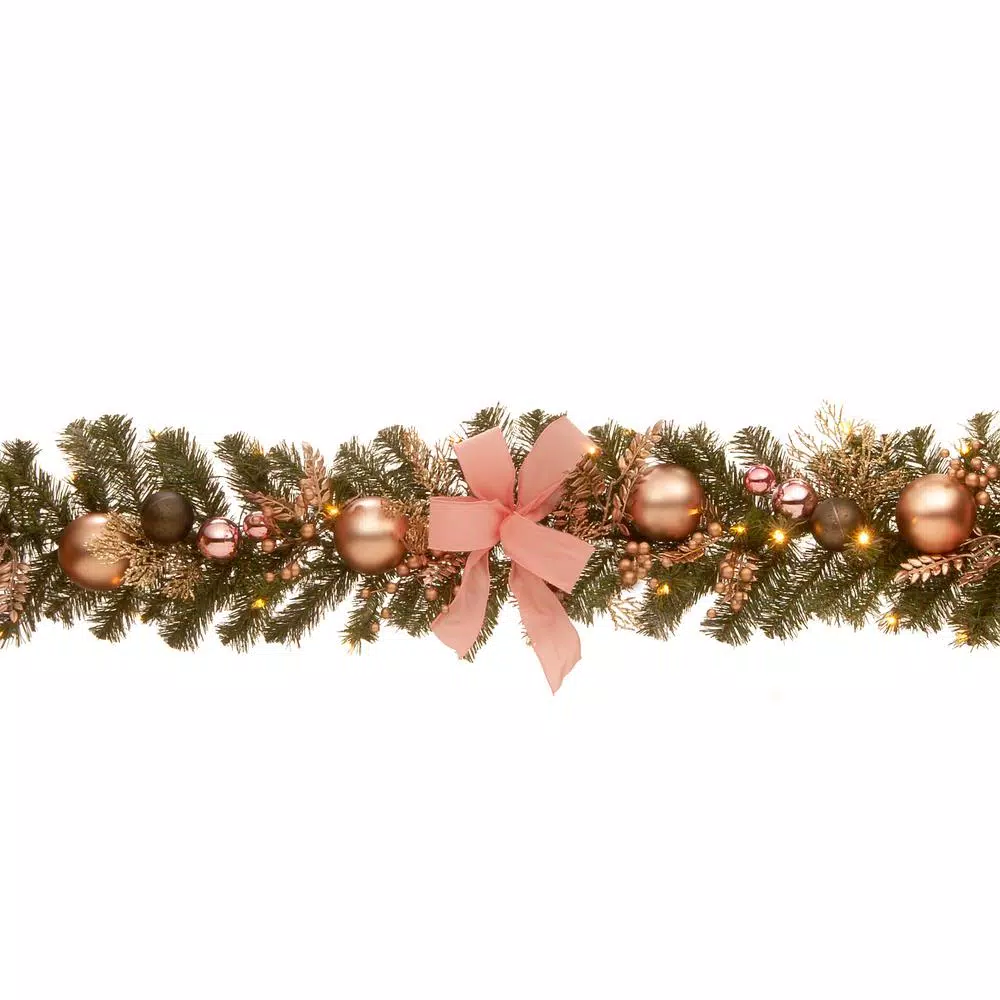 This evergreen garland is decorated with silver colored leaf sprigs, berry clusters and ball ornaments in assorted sizes. A silver bow and ribbon for added holiday flair. This garland is also pre-lit with 30 battery operated warm white LED lights. This indoor/outdoor garland can be displayed over doors, windows, fireplace mantels, fence, or stairway railings.