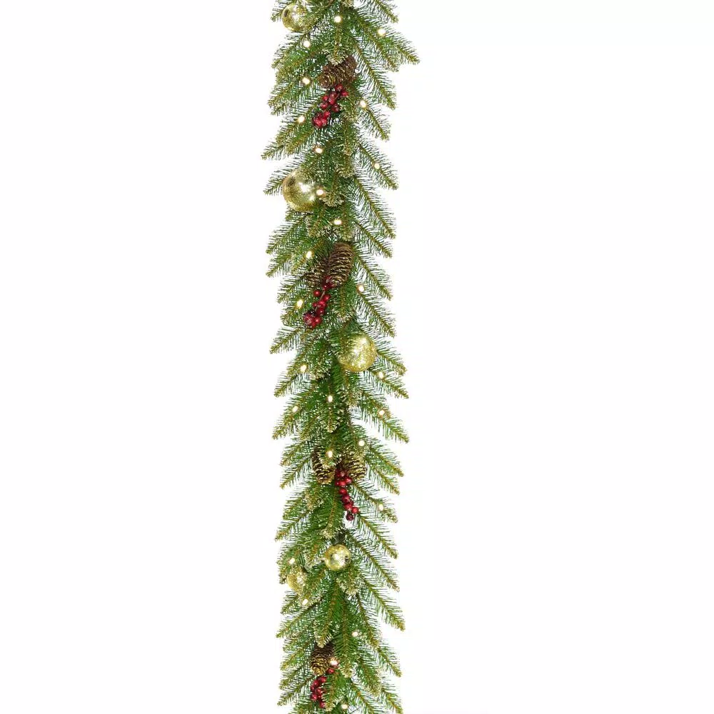 The Glittery Gold Dunhill Fir garland features snow-sprinkled branch tips trimmed with red berries, pinecones and glossy gold ball ornaments. It is pre-strung with 100 battery-operated warm white LED lights that are energy-efficient and long lasting. 6-hours ON/18-hours OFF timed operation. This indoor/outdoor garland can be displayed over doors, windows, fireplace mantels, fence or stairway railings.