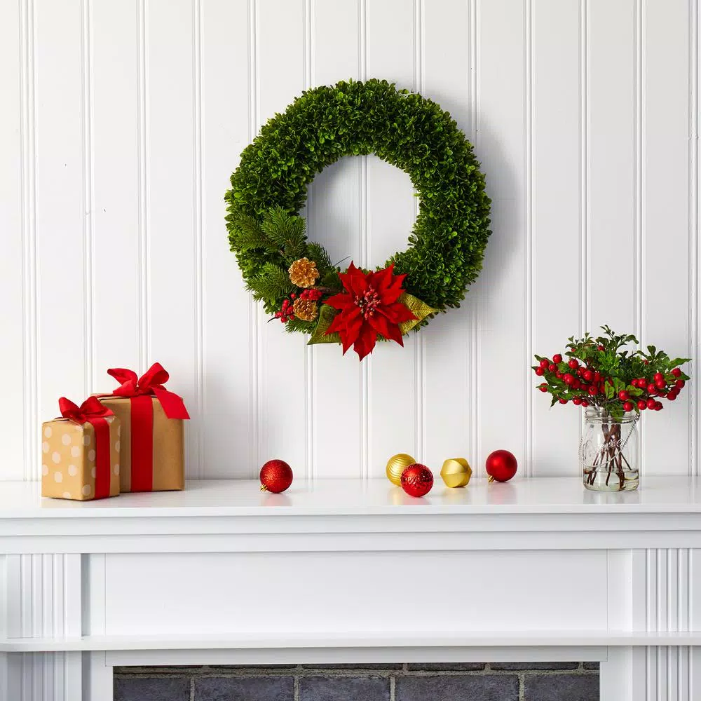 Update your traditional decor accents with the beauty provided by this artificial wreath intricately designed from realistic looking tea leaf foliage, handsomely accented with a silk poinsettia blossom in full bloom, carefully nestled with complementary berry and pine greenery. Great for year-round display, this artificial wreath makes for an inviting accent and will undoubtedly transform your home’s front-door appeal. Silk plants are manufactured using synthetic materials, such as polyester material or plastic, and are well designed and constructed to be life-like in appearance. This item will need to be re-shaped when removed from the secure box to allow it to reach its fullest size. Your artificial plant will look beautiful for years to come; simply wipe clean with a soft dry cloth when needed. About Nearly Natural Inc. – For over 75-years, Nearly Natural Inc. has been providing conscientious consumers with beautiful alternatives to natural decorations. Employing and advised by naturalists who understand the live plant world, Nearly Natural is able to recreate the most realistic-looking decorative items for homes, offices, and businesses. Driven by a true commitment to customer service, attention to detail, and natural philosophy, Nearly Natural strives to bring customers the most beautiful, unique, and striking faux plants and floral on the market.