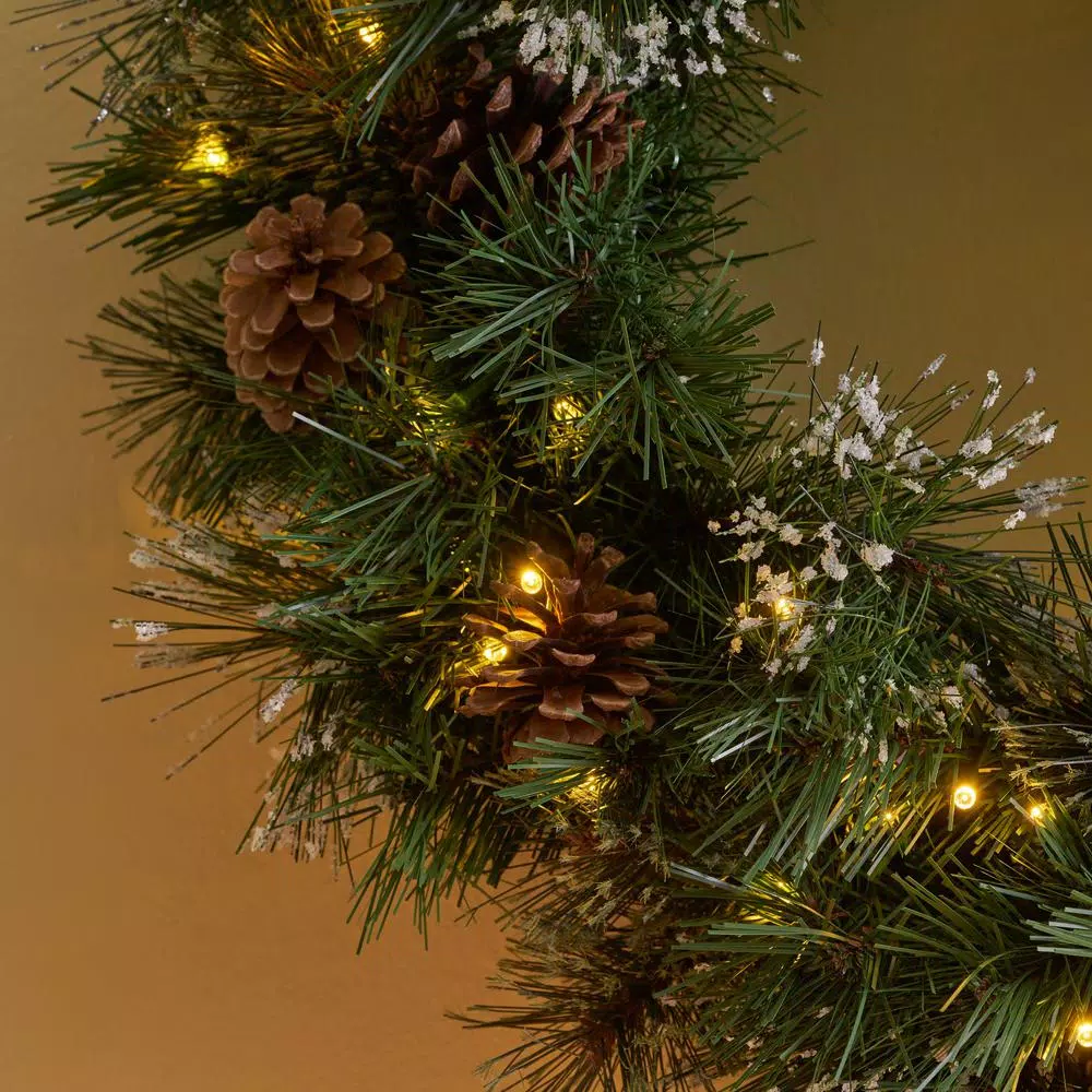 - Includes: 1 pre-lit Christmas wreath with snowy branches and pinecones