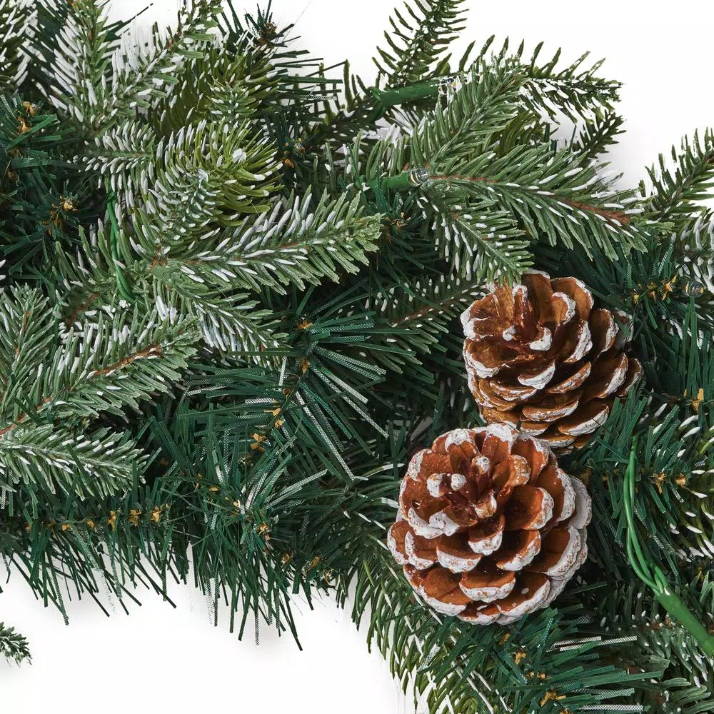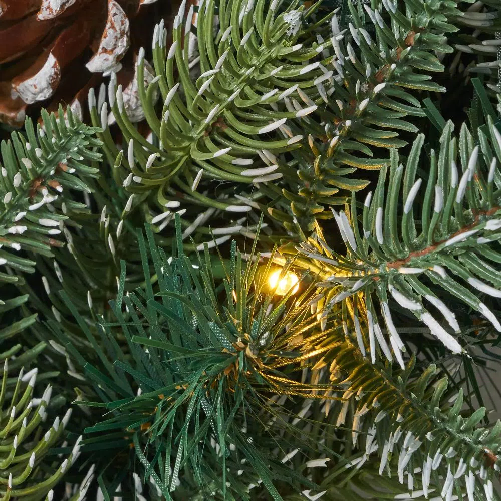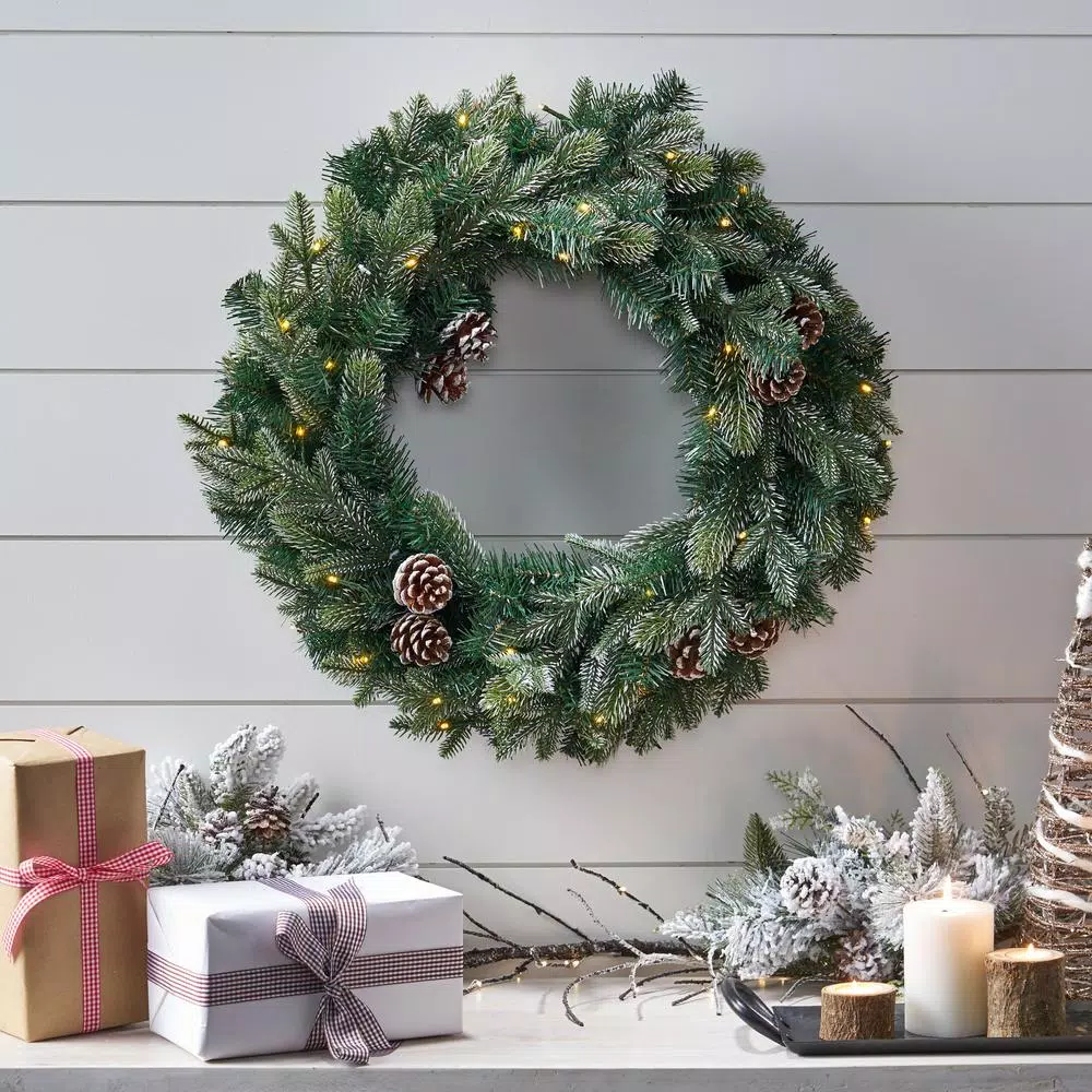 Greet the holidays with festive cheer by bringing some eye-catching decor for your home. Our Christmas wreath offers your home a splendid ring of deep green mixed spruce needles, pine cones, and shimmering LED lights to complete the look. These lights come with a convenient battery box, creating the perfect decorative accessory for any blank space. Featuring a sturdy iron frame to keep its shape, this lovely wreath offers a beautiful classic arrangement that will bring holiday cheer to your home for years to come.