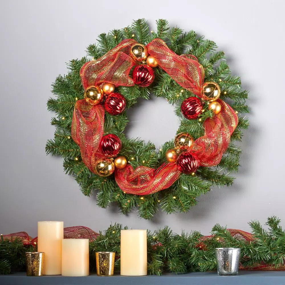 Welcome your guests with jolly greetings and happy holidays starting right at your front door. Our Christmas wreath offers your home a beautiful ring of deep green fir needles with a garland of mesh ribbon to complete the look. This is woven together with shimmering lights and is topped with an array of gold and red ornaments, creating the perfect decorative accessory for any blank space. Featuring a sturdy iron frame to keep its shape, this lovely wreath can be used for years to come.