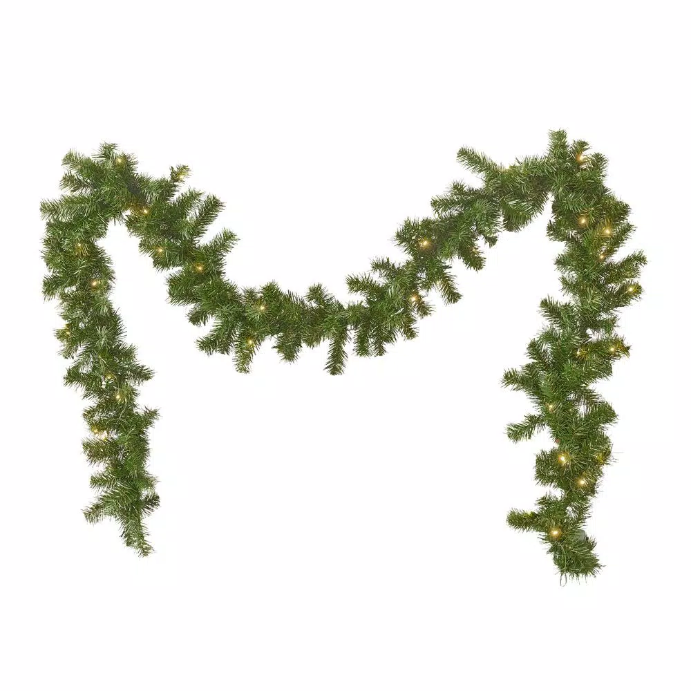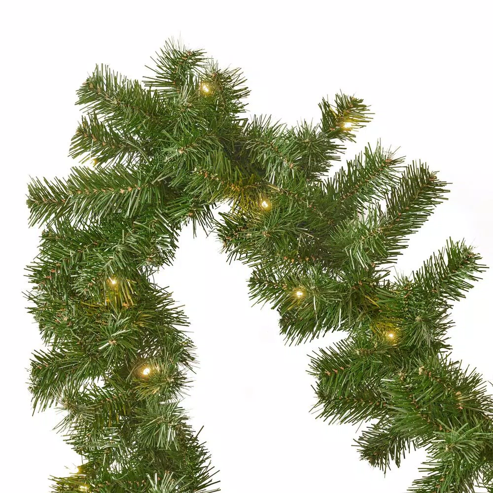 Deck the halls with this 9 ft. Noble Fir garland this holiday season. Pre-lit with 50 warm-white LED lights, this garland is battery-operated and includes a timer. Perfect for adding a festive touch to your living room, bannister or front door.