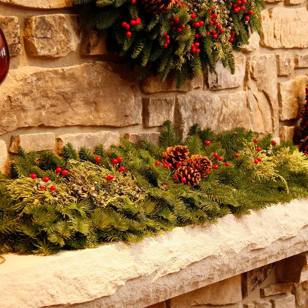 - Versatile 4 ft. mantel garland is festive blend of fresh fragrant noble fir, blue berried juniper, incense cedar and ponderosa pine cone use just about anywhere, on mantel, table, side board, kitchen counter or use as a door swag can’t go wrong and never the wrong choice, enhance with lights, bows and ornaments to suit your decor and to make them even more festive