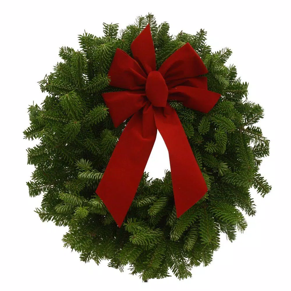 Decorate with these thick and full, holiday wreaths with their simple traditional holiday scheme. Each wreath contains 2-1/4 lbs. of premium, live Maine balsam greens and a hand-tied, weatherproof, red velveteen bow.