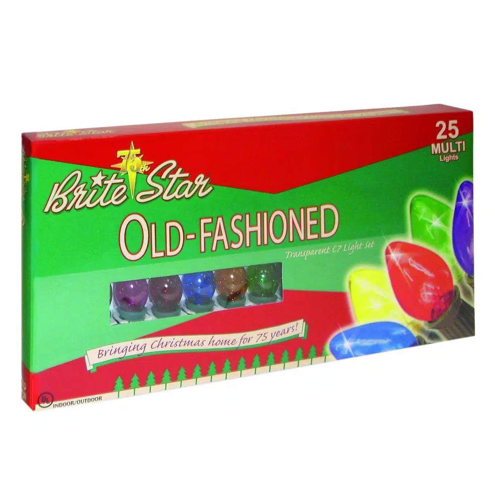 This set includes 1 box of translucent Multi-Colored old-fashioned lights. The big C-7 bulbs will bring back memories of Christmas-past. Each strand measures 25 ft., including a 6 in. lead cord, 12 in. spacing in between bulbs and a 6 in. end cord. Replacement bulbs and fuses included. Suitable for both indoor and outdoor use.