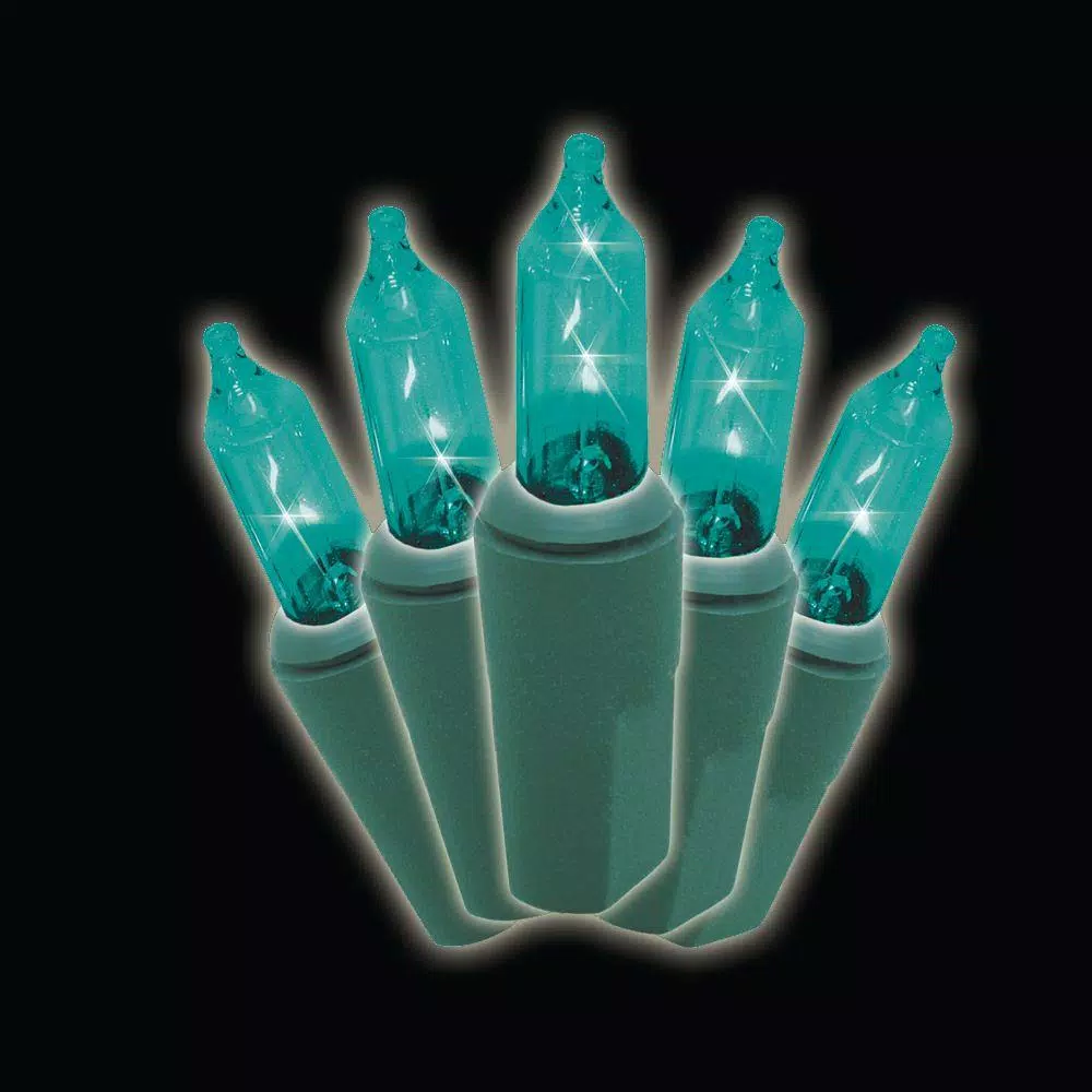 Each strand has 50 teal incandescent mini-bulbs on green wire to blend in with your Christmas tree or landscaping. 19.15 ft. total string length includes an 18 in. lead cord, 4.25 spacing between bulbs and a 3.5 in. end cord. Suitable for indoor and outdoor use, UL-listed, set of 2.