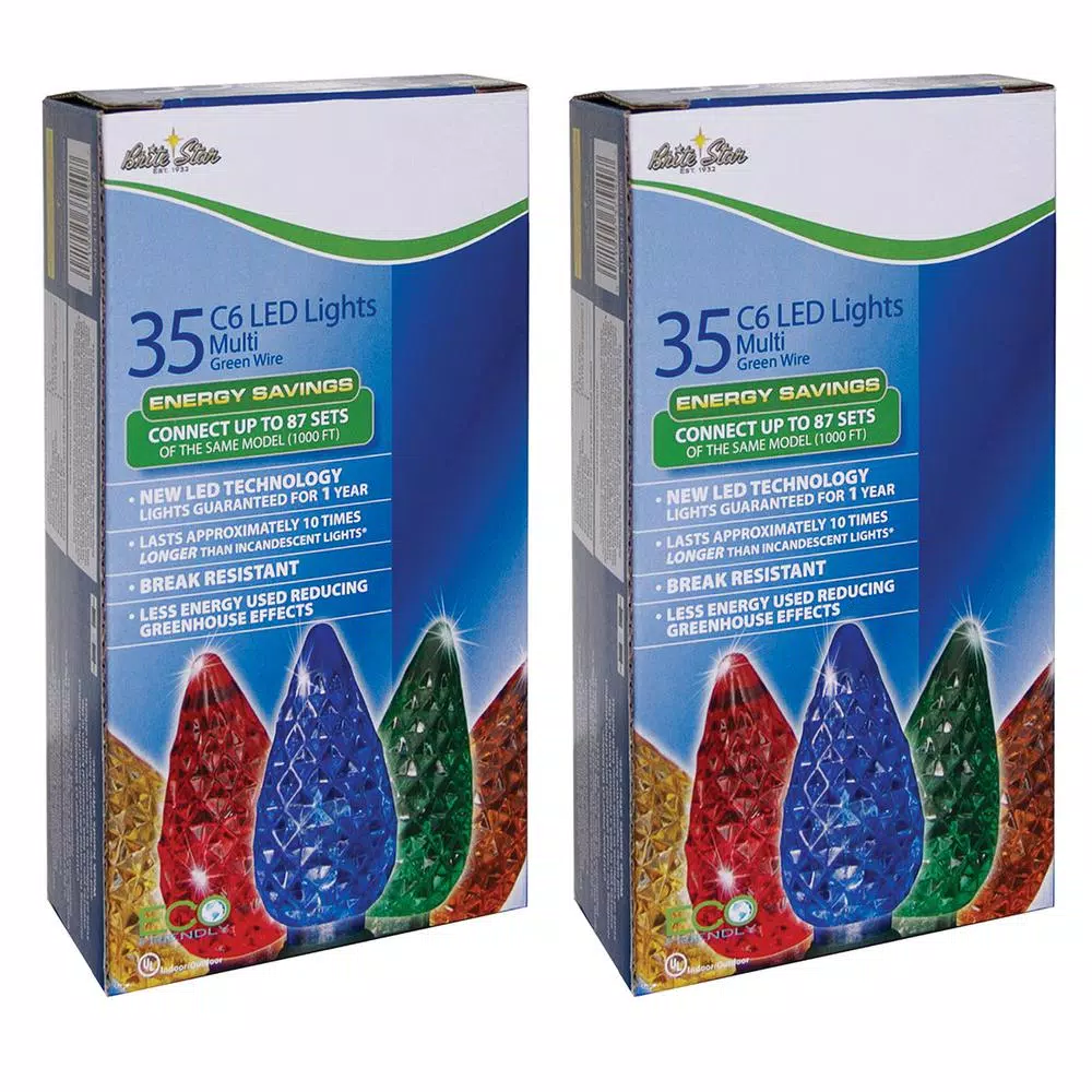 Multicolor C6 LED bulbs bring a classic, old-fashioned ambiance to your holiday decor. LED lights save energy are cool to the touch, making them safe around children and pets. Each strand has 35 bulbs and measures 12 ft., including a 4 in. lead cord, 4 in. spacing between bulbs and 4 in. end cord. Includes spare bulbs and fuses. Strung on green wire to blend in with Christmas tree and exterior landscaping. Set of two, 35-light strings for 70 total bulbs. Suitable for indoor and outdoor use. UL-listed, box of 2.