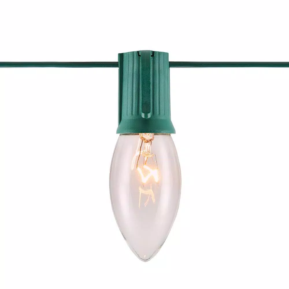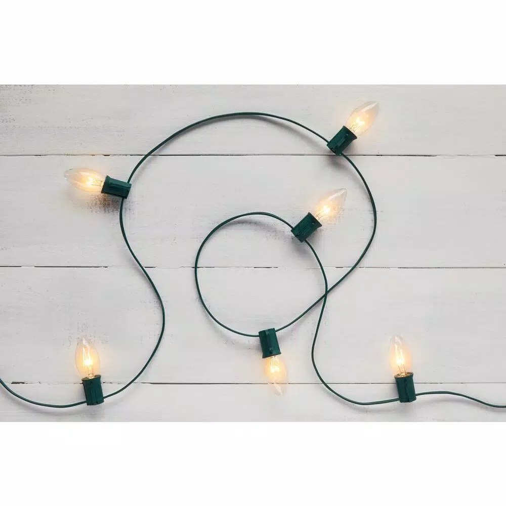 Create a classic Christmas atmosphere with this set of two 25-bulb incandescent C9 string lights. Perfect for a variety of light decorating designs, it features green wire that virtually vanishes within bushes and trees. These high-quality Christmas lights are easy to set up and to replace. They remain lit, even if a single bulb expires. Use the sets to decorate indoor and outdoor holiday gathering spaces.