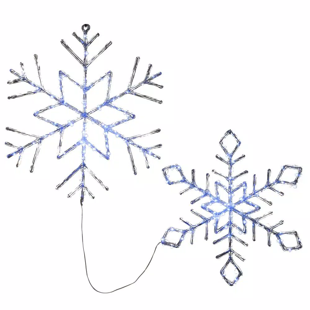 This unique holiday decoration includes 2 snowflakes featuring different shapes that are wrapped with mini white LED lights. They are constructed of strong but lightweight clear acrylic material and each includes a loop for window, wall or door hanging. Snowflakes are connected for side-by-side display. For indoor or covered outdoor use.