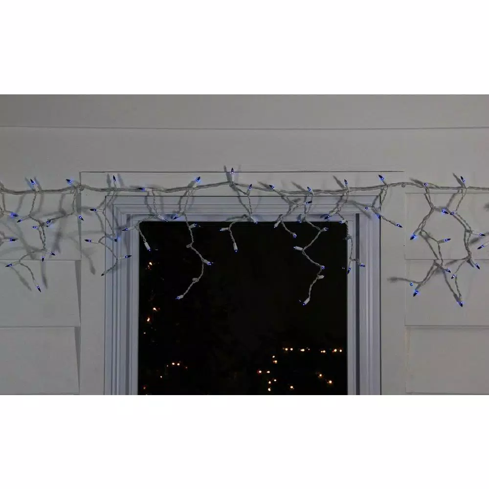 Add some twinkle to your Christmas decor with these blue icicle lights. Mounted on a white wire, 100 lights are spaced three inches apart. Lights are equipped with the Lamp Lock feature, which makes them replaceable, interchangeable, and keeps them from falling out.