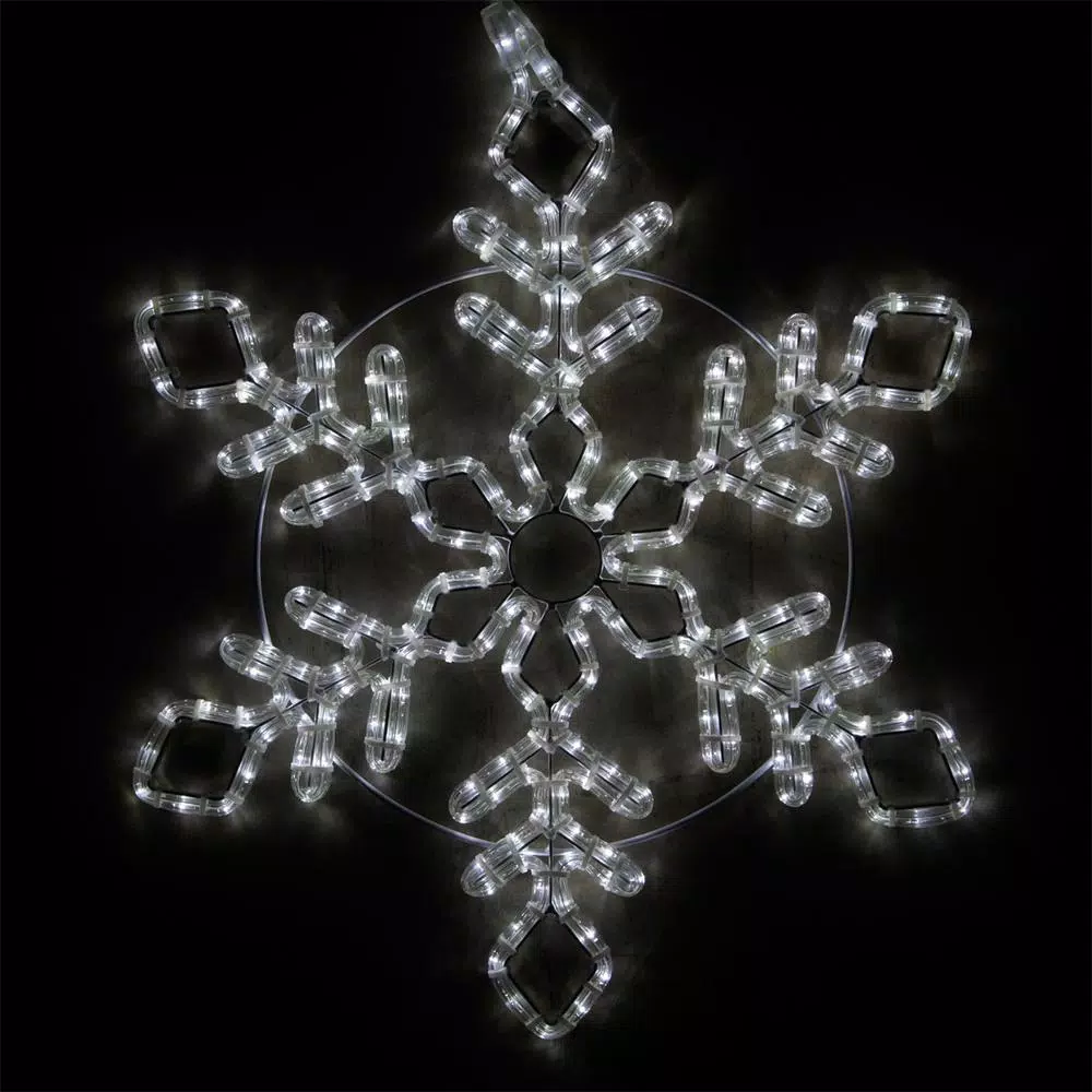 They say every snowflake is unique, but this may be the most unique and beautiful snowflake decoration you ever see. This cool white hanging snowflake motif features diamond-shaped tips on the end of its branches, with a diamond-shaped design in the center, for an effect that makes a statement. The long-lasting, energy efficient LED mini lights are encased in UV resistant PVC tubing and strapped to a sturdy metal frame, so this snowflake will keep shining brightly even through the darkest nights. And its long 6 ft. lead cord is ideal for hanging display. Perfect for hanging from trees, fences or other exterior surfaces.
