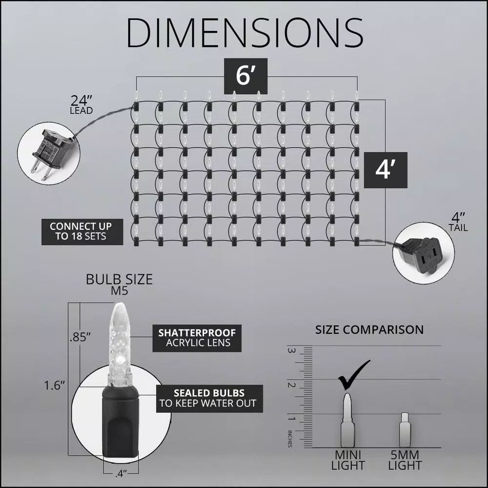 - Connect up to 18 net light sets end to end for 432 sq. ft. of total coverage on one plug