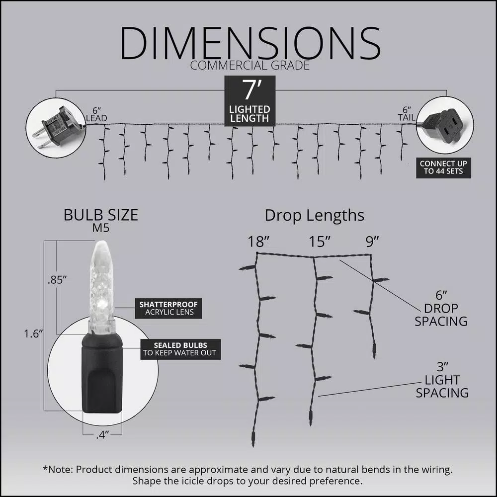- 70 blue and cool white M5 LED icicle lights on white wire, 15 vertical drops in lengths of 18 in., 15 in. and 9 in., approx.7 ft. lighted string length