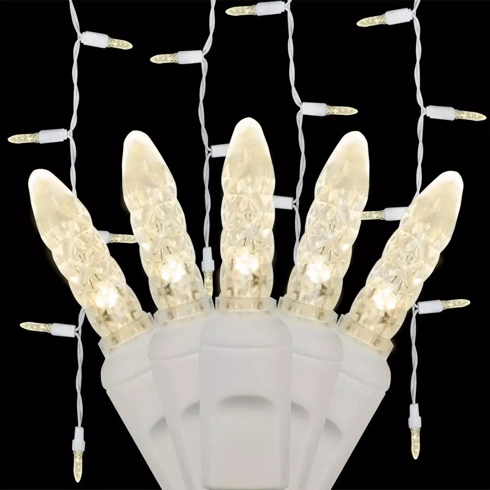 - 70 warm white M5 LED icicle lights on white wire, 15 vertical drops in lengths of 18 in., 15 in. and 9 in., approx.7 ft. lighted string length