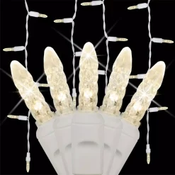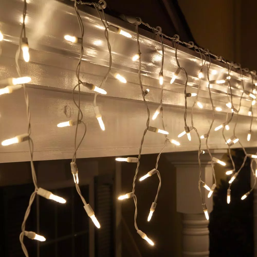 - 70 warm white M5 LED twinkle icicle lights on white wire, 15 vertical drops in lengths of 18 in., 15 in. and 9 in., approx.7 ft. lighted string length