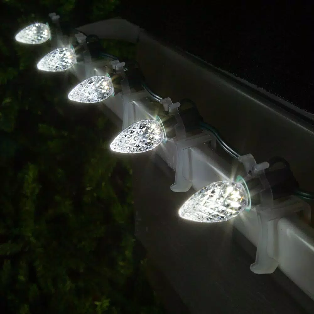 - Box of 25 cool white faceted C7 OptiCore LED Christmas light bulbs, E12 (candelabra) base; fits any standard C7/E12 sized socket