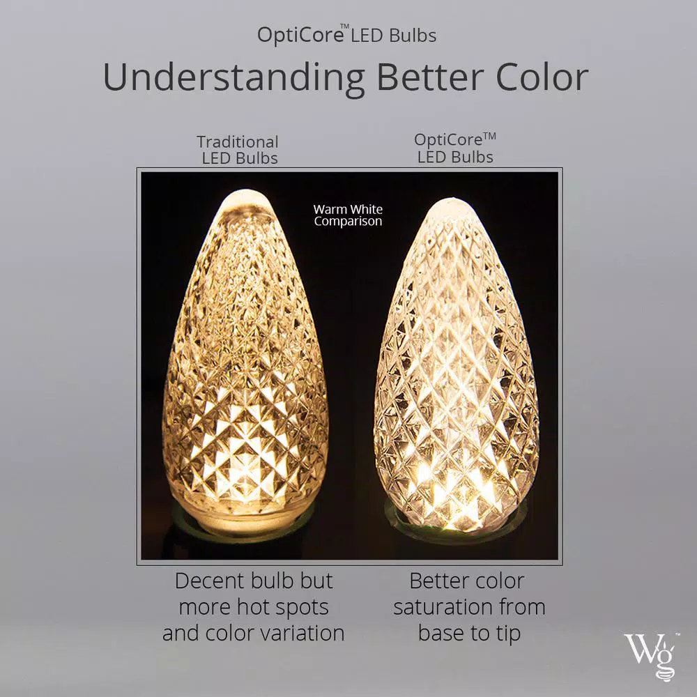 OptiCore smooth light bulbs re-create the rich color and warm beauty of vintage incandescent Christmas lights, but with all the advantages of LED. The opaque lens is 115% thicker than ordinary bulbs and made of polycarbonate, up to 200 times stronger than glass. This makes OptiCore bulbs virtually unbreakable. The SMD LED diode inside saturates the lens evenly with vibrant light, giving these bulbs that old-fashioned glow from any viewing angle. And with an average lifespan of 60,000-hours, these are bulbs that will last for years. Get the energy efficiency and durability of LED with all the richness and color of old-fashioned Christmas lights in these OptiCore LED smooth/opaque Christmas light bulbs.