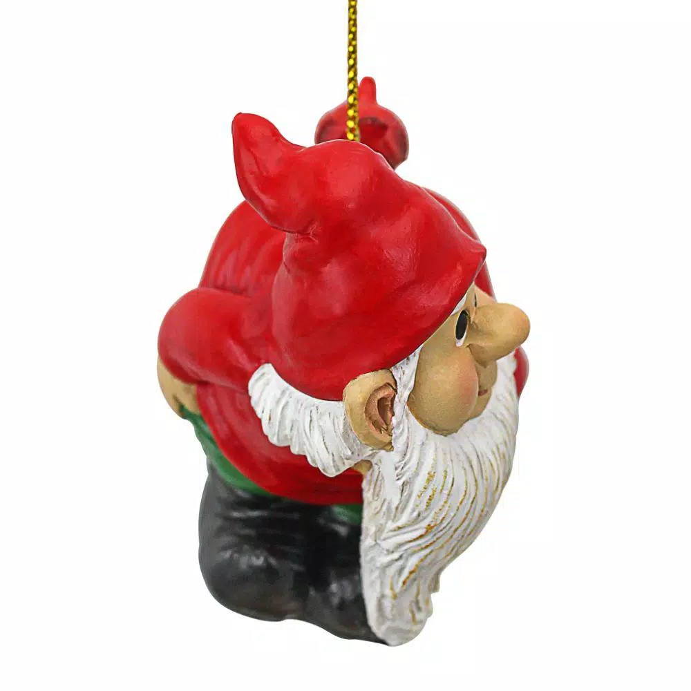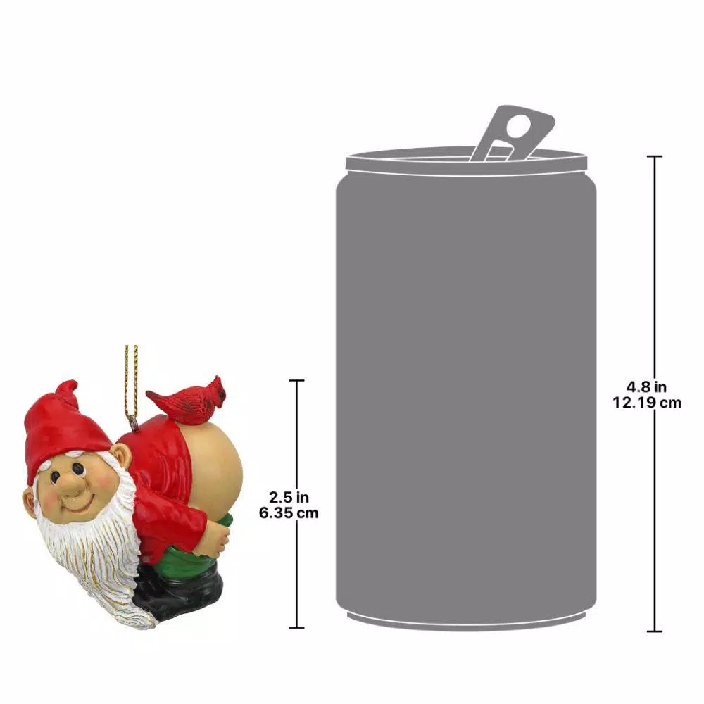 Add a super-friendly, gnome’s vertical smile to your holiday season with our Design Toscano-exclusive collectible gnome ornament. Moonie, our magical garden elf, leaves nothing to the imagination as he offers up such a complete 360° view of his bright-n-shiny buttocks that a cardinal even uses it as a landing pad. Cast in quality designer resin to capture dwarf details from burly beard to characteristic forest gnome cap, our Design Toscano-exclusive pixie collectible is hand painted in eye-catching holiday hues of red and green. A golden string hanger makes this woodland sprite bauble perfect on your Christmas tree, in a holiday window or as a playful gift for those who love a bit of unique fun and a good conversation piece. 2.5 in. W x 2 in. D x 2 in. H, 5 lbs. each.