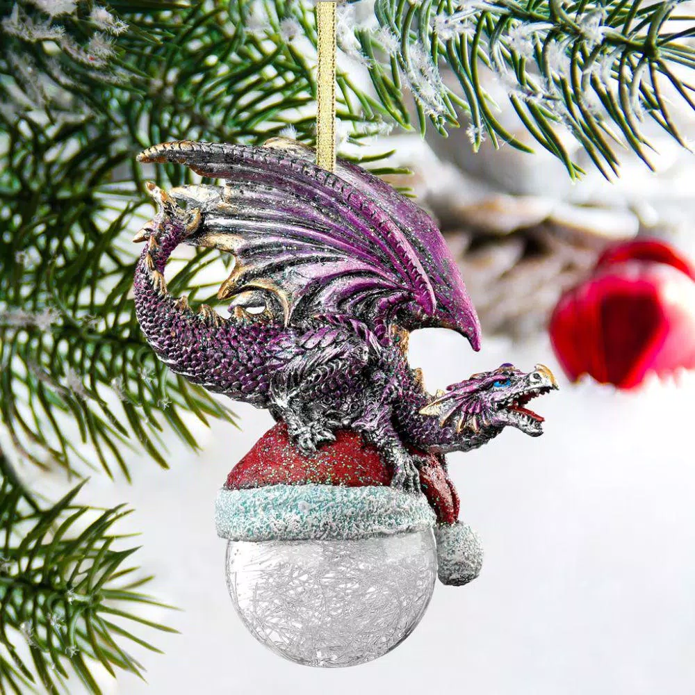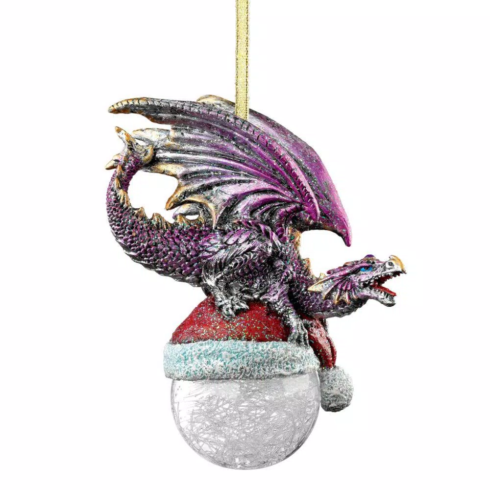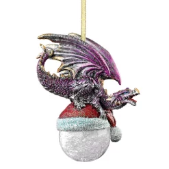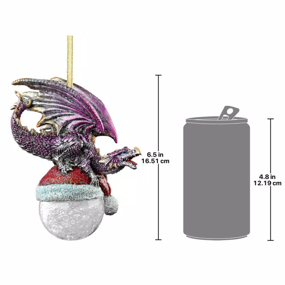 Instead of its usual perch on the North Pole, our Design Toscano exclusive dragon ornament has decided to sit snugly on the cap of Old Saint Nick himself. From a mystical land of ice and snow, our limited edition holiday dragon ornament, designed by artist Liam Manchester, is anchored on a sparkly glass orb. He’s expertly cast this collectible in quality designer resin, hand-painted it in hot metallic hues with glitter-kissed wings, and added a matching ribbon hanger. This one-of-a-kind Christmas tree decoration will be a legendary addition to your Gothic dragon collection. 5 in. W x 2 in. D x 6-1/2 in. H, 1/2 lbs.