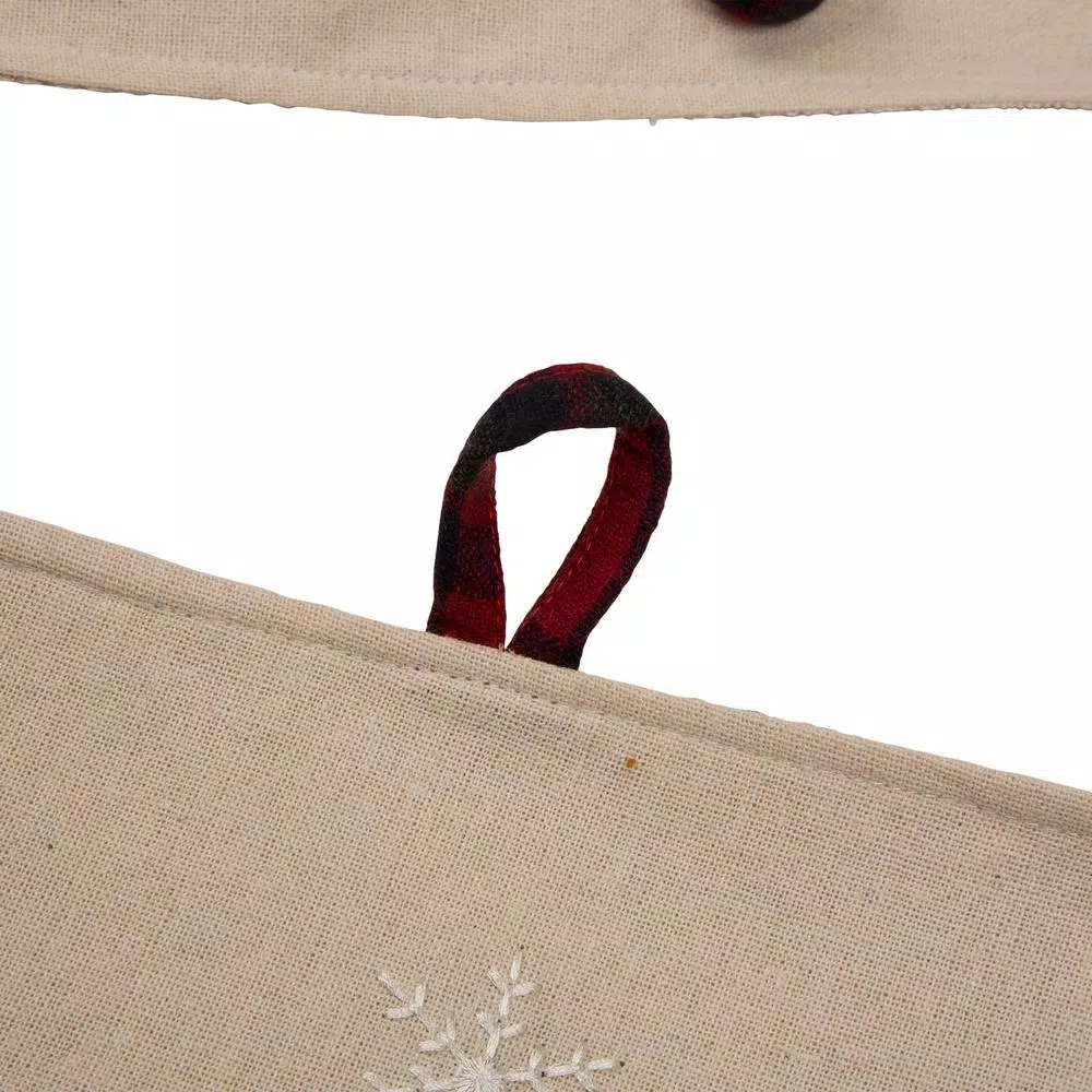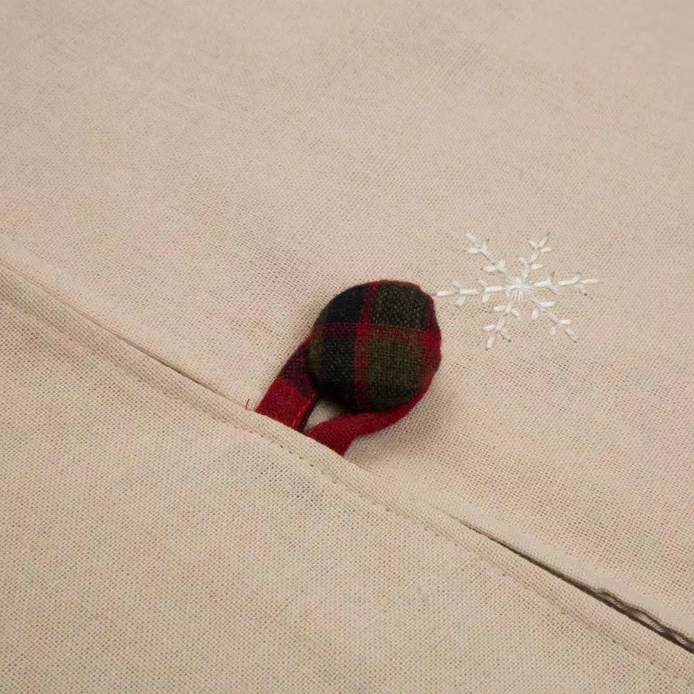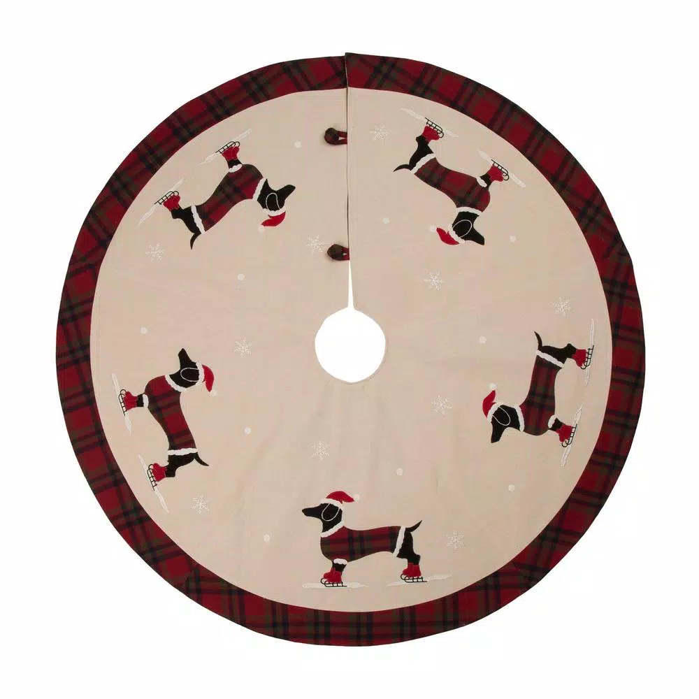 Tree skirt features embroidered with 5 lovely Christmas dog design sure to enhance your Christmas tree. Brighten your family gatherings with the delicate look of red plaid edge which adds an extra-decorative touch beneath the tree. Close with 3 buttons.