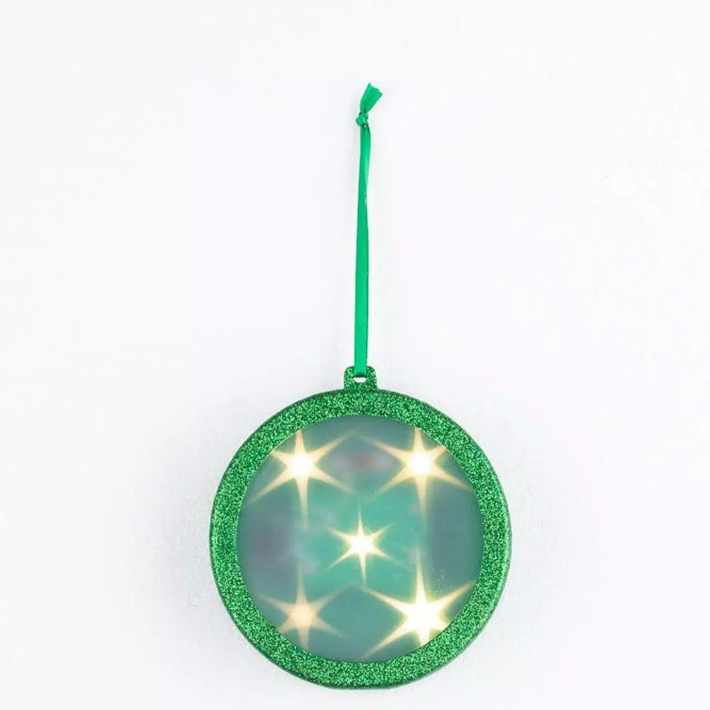 Trim the Christmas tree this year with lighted ornaments. These ornaments bring your tree to life with their stunning holographic effect. Each plastic ornament features an opaque window that shines 5 warm white lights in a star holographic light display. A glitter exterior adds the finishing touch. The holographic ornament features a flat bottom which allows this ornament to sit on a flat surface. Perfect addition to any Christmas Tree, staircase, or tabletop scene. The lights are battery operated and features a built-in timer function that runs 5-hours on and 19-hours off. indoor use only. Requires 3 AAA batteries (not included). Available in 4 color options: Gold, Silver, Green and Red. Measures 4.5 in. L x 1.3 in. D x 4.5 in. H. 2.8 lbs.