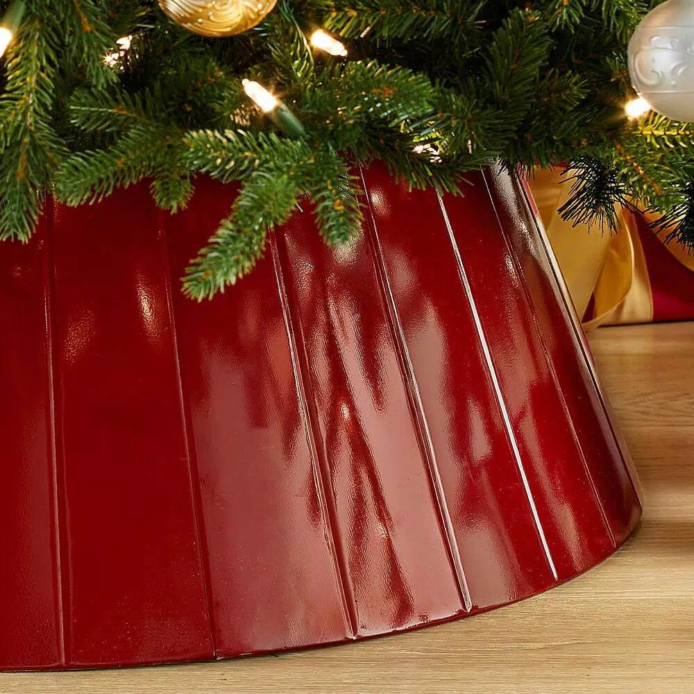 Dress up your Christmas tree with this red metal Christmas tree collar. Made for trees of any size, shape or color, the versatile design works with a variety of holiday decor. This festive tree collar keeps everything neatly contained, producing a streamlined look underneath your tree. Made from sturdy metal, you can use this collar to cover up average tree stands for seasons to come.