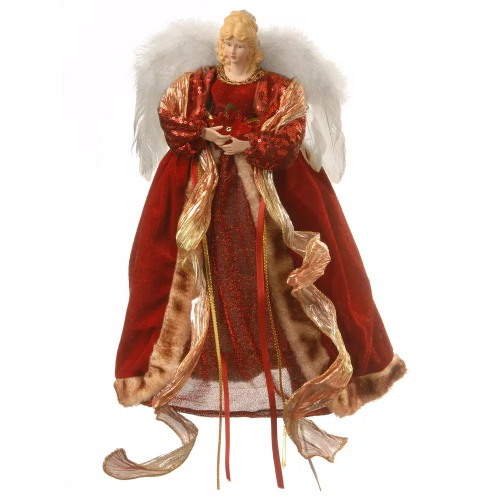 This angel decoration features flowing faux fir trimmed gown with ornate burgundy and gold design. White faux fir wings give this angel a soft and whimsical appearance. Arms can be moved to add personal expression. For tabletop display or can be used as a tree top ornament.