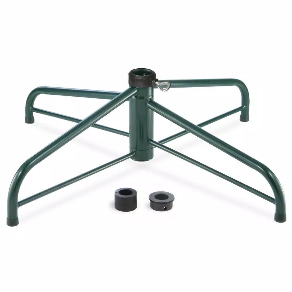 This folding metal tree stand is for use with 9 ft. to 12 ft. tall artificial trees with 1.25 in. to 2 in. Dia center poles (adaptor is included for use with 1.25 in. pole). This stand features sturdy steel construction and folds flat for convenient storage. Includes thumb screw for securing stand to tree pole.
