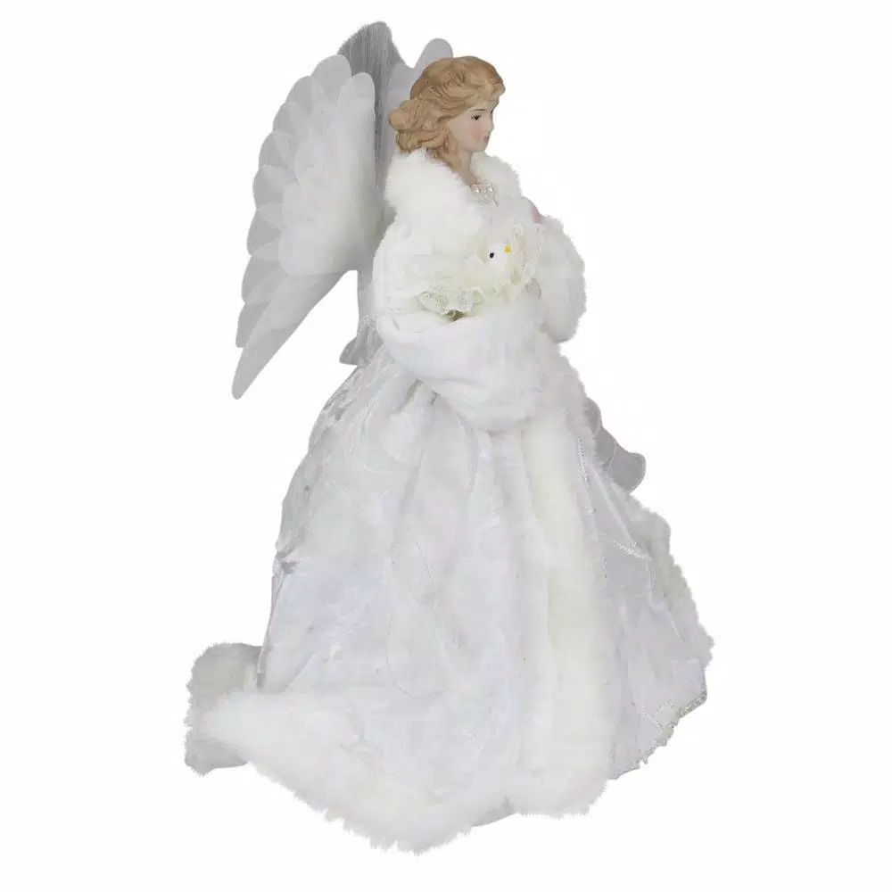 This tree topper angel is dressed in a lavish white coat, trimmed with white fur. Beneath her coat is a white dress with a dazzling pearl collar. It is featured with stiffened white wings outlined in fiber optics.