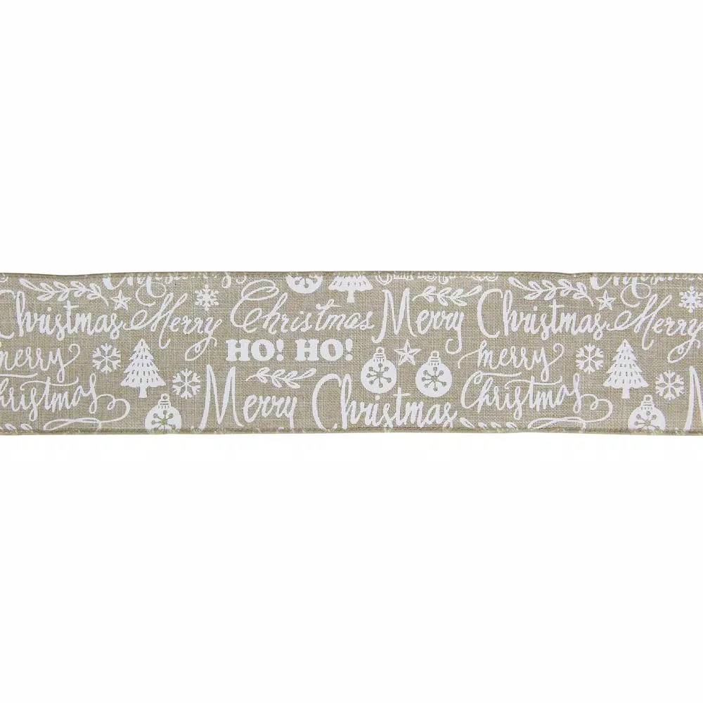 This gorgeous beige Merry Christmas burlap style ribbon with white designs and lettering is great for decorating your gifts and home for the holiday season. The wired ribbon will help everyday designs maintain their shape and beauty. Whether you’re a florist an event planner or crafter wired edge ribbon is a dream to work with. Add this ribbon to your Christmas tree wreaths mantles or stairway for beauty and glamour. Features: Design includes the colors beige and white. Ribbon has Merry Christmas and HO HO written on it. Sewn wire edged ribbon allows you to bend and shape your creations to decorate with ease. Ribbon comes on (1) spools. Perfect for holiday decor. Dimensions of each spool: 2.5 in. W x 16 yds. in length. Material(s): polyester/burlap.