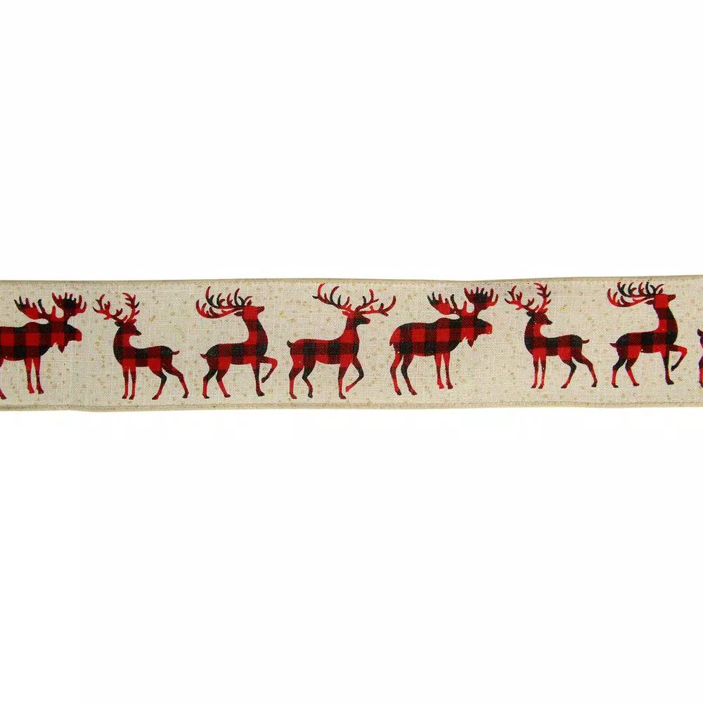 This gorgeous Buffalo plaid reindeer ribbon with sparkles would be a great way to decorate your gifts and home for the holiday season. The wired ribbon will help everyday designs maintain their shape and beauty. Whether youβre a florist an event planner or crafter wired edge ribbon is a dream to work with. This ribbon is perfect for adding to your Christmas tree mantle or stairway for sparkle and beauty. Features: Beige ribbon with gold sparkles. Reindeer with a red and black checkered pattern. Sewn wire edged ribbon allows you to bend and shape your creations to decorate with ease. Ribbon comes on (1) spools. Perfect for holiday decor. Dimensions of each spool: 2.5 in. W x 16 yds. in length. Material(s): polyester/burlap.