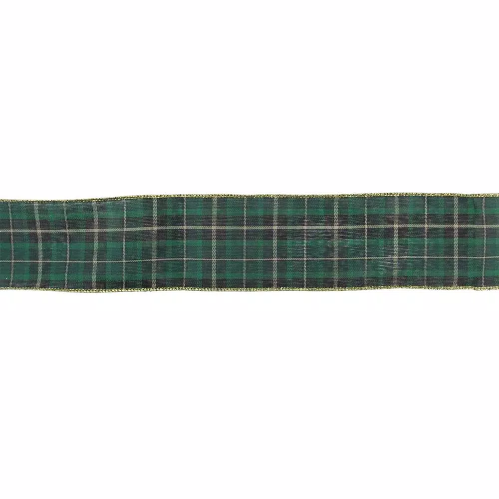This gorgeous Christmas plaid ribbon with sparkling shiny gold trim would be a great way to decorate your gifts and home for the holiday season. The wired ribbon will help everyday designs maintain their shape and beauty. Whether youβre a florist an event planner or crafter wired edge ribbon is a dream to work with. Add this ribbon to your Christmas tree mantle or stairway for sparkle and beauty. Features: Ribbon has a green plaid pattern. Sewn wire edged ribbon allows you to bend and shape your creations to decorate with ease. Ribbon comes on (1) spools. Shiny shimmering gold trim. Perfect for holiday decor. Dimensions of each spool: 2.5 in. W x 16 yds. in length. Material(s): polyester.
