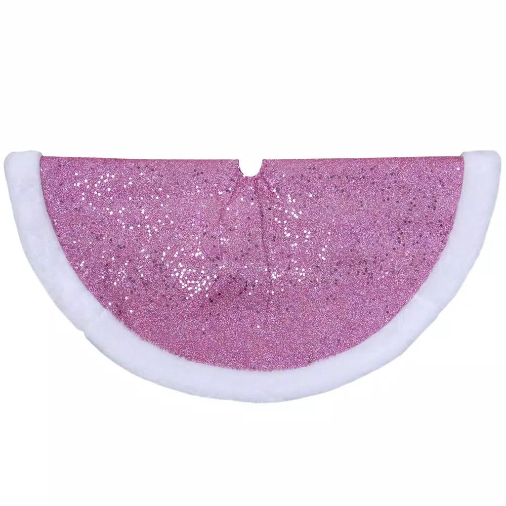 There can never be too much glitter when it comes to Christmas. Add some sparkle to your holiday decor with this glittered mini tree skirt. The tree skirt is pink embellished in glitter with a faux fur lining. Great for all kinds of holiday decorations including tree trimming mantle displays tabletops centerpieces and more. Product Features: Pink Christmas tree skirt. Features holographic glittered base. Trimmed in white faux fur with a mesh lining. Contians 2 hook and loop fastener fasteners. The tree skirt is circle in shape. Recommended for indoor use only. Dimensions: 20 in. Dia. Material(s): polyester.
