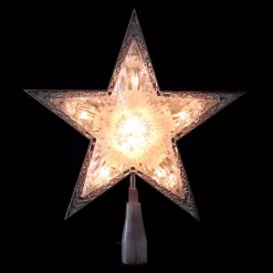 This classic star tree topper is anything but ordinary. The clear prism crystal casts a warm white glow. The scrolling adds elegance and chic style. The perfect compliment to any tree mantle or even a window. This tree topper is clear star shaped and comes accentuated with a scroll patterned border. Product Features: Color: clear bulbs/green wire. Number of bulbs: 10. Bulb size: mini. 28.5 in. green lead cord. Double-sided design. Additional Product Features: UL listed for indoor use only. If 1 bulb burns out the rest will stay lit. Comes with replacement bulbs spare fuses and cone to attach to tree. Contains 1 plug with end connector which allows you to stack multiple lighted items together (not to exceed 210-Watt). Wire gauge: 22. 120-Volt 60 Hz 08 Amp 9.6-Watt. Dimensions: 9 in. H x 9 in. W x 1.25 in. D. Material(s): plastic/glass bulbs/wire .