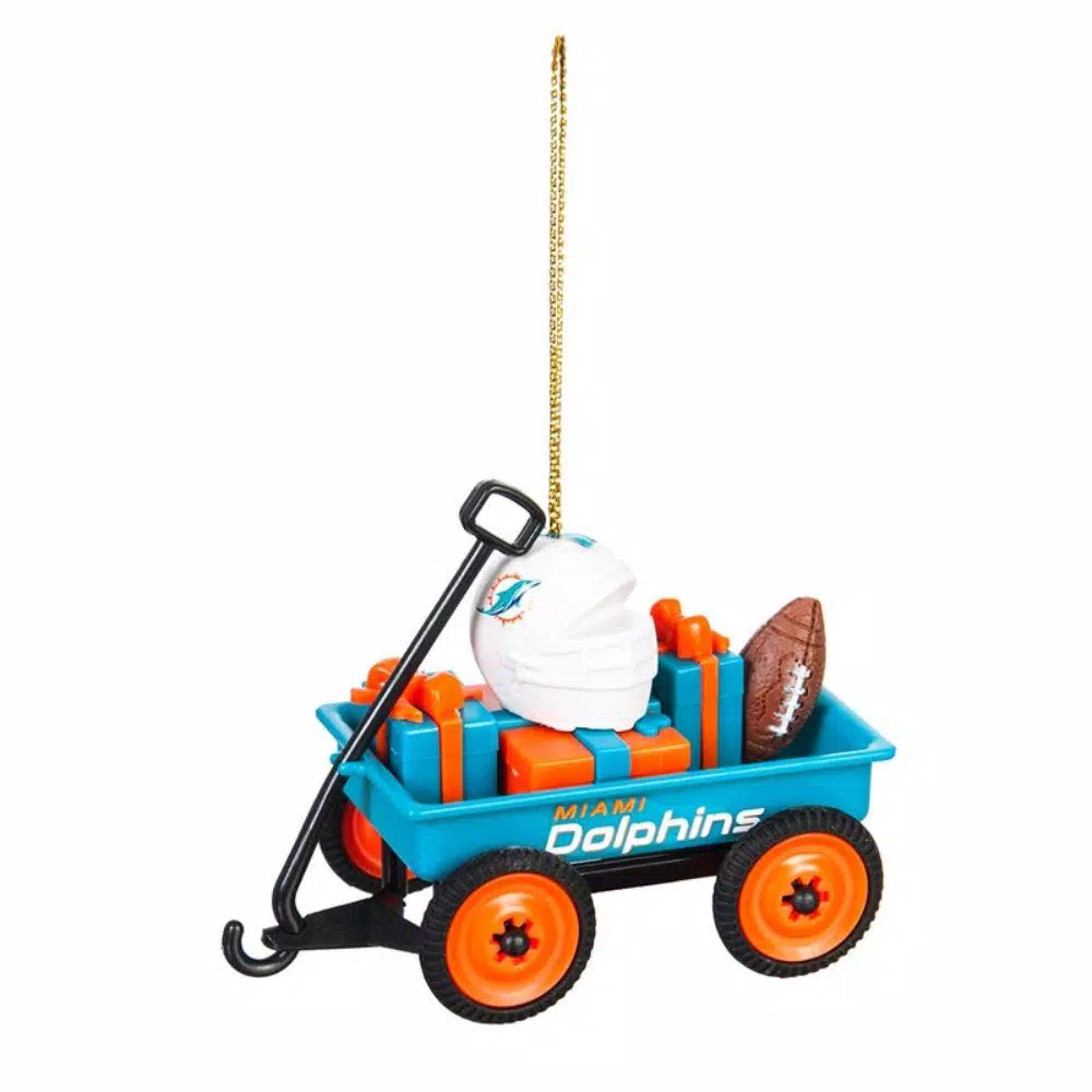 Reminiscent of the vintage Radio Flyer wagon, this Miami Dolphins whimsical Christmas ornament carries a couple of gift boxes, the team helmet and ball. Perfect for any sports fan. Makes a great gift. Classic design will delight fans young and old alike.