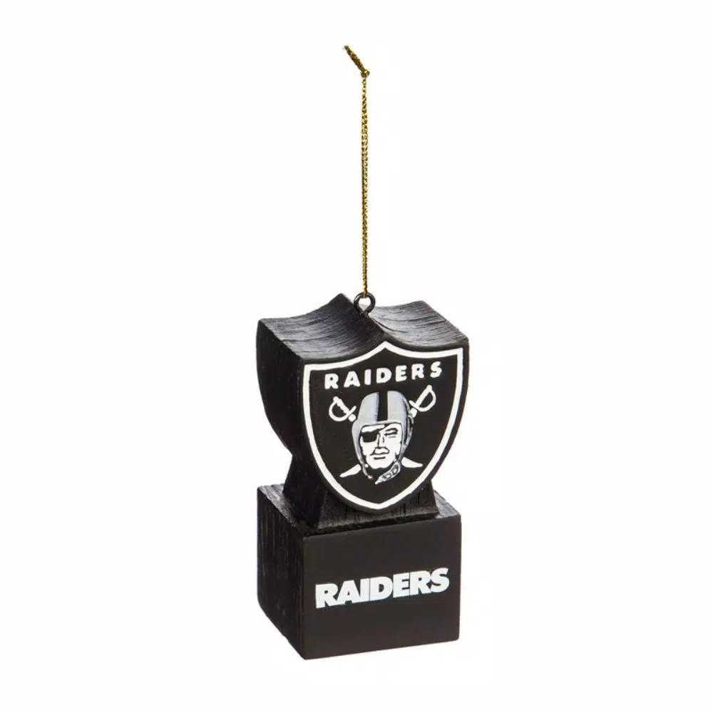 This unique Christmas ornament features the Oakland Raidersโ shield logo on top and team logo on a block beneath. Made in the Likeness of our Team Garden Statue, this is a must-have for the holiday season. Makes a great gift. Will delight fans young and old.