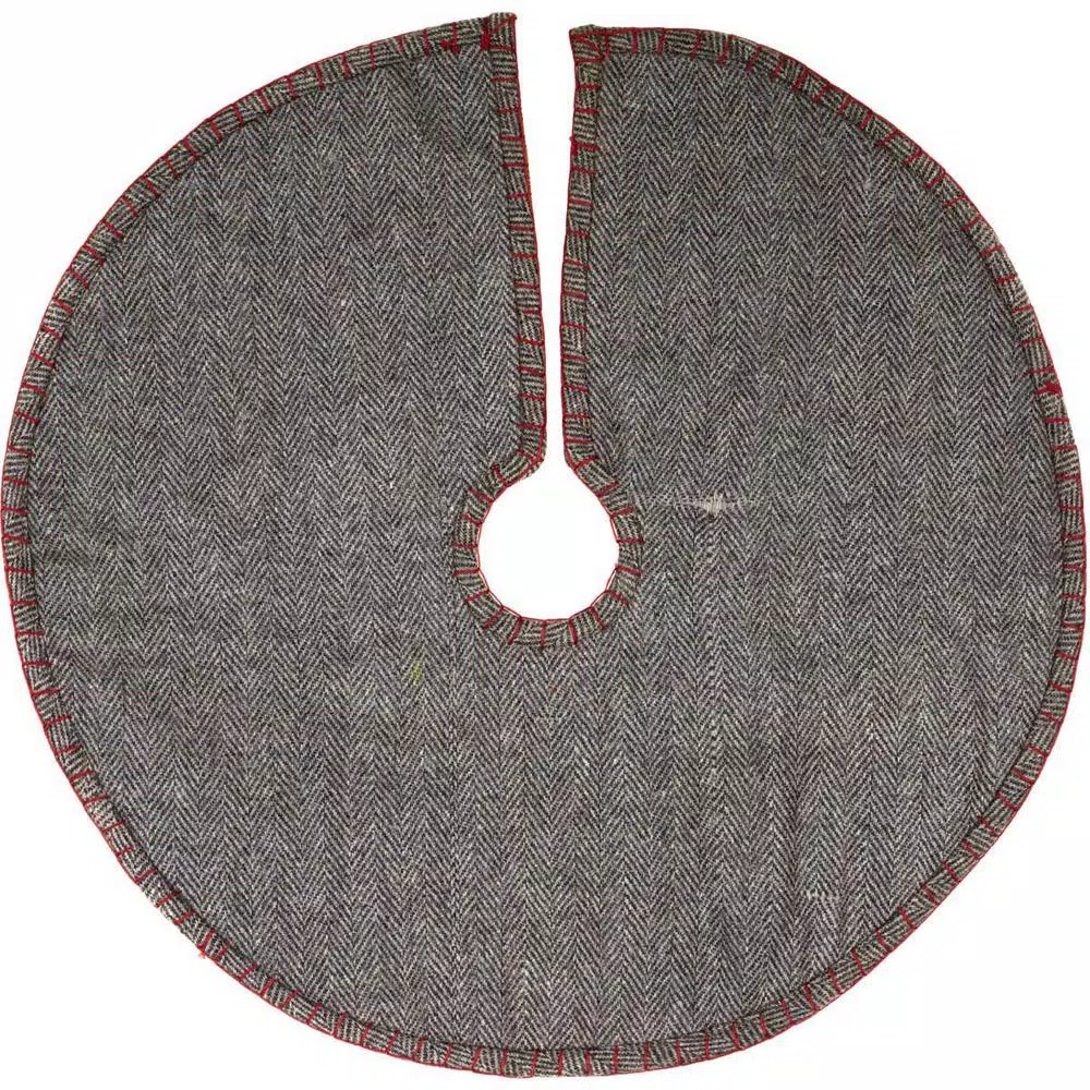 Bring the tasteful holiday rustic look of the Anderson Plaid Mini Tree Skirt home this year. It all comes together in a classy cherry red, iron grey, and marshmallow textured woven plaid, for a timeless addition to your Christmas decor. The skirt is finished with a turned edge seam with cherry red whip stitching. Reverses to 2-tone grey herringbone weave felt.