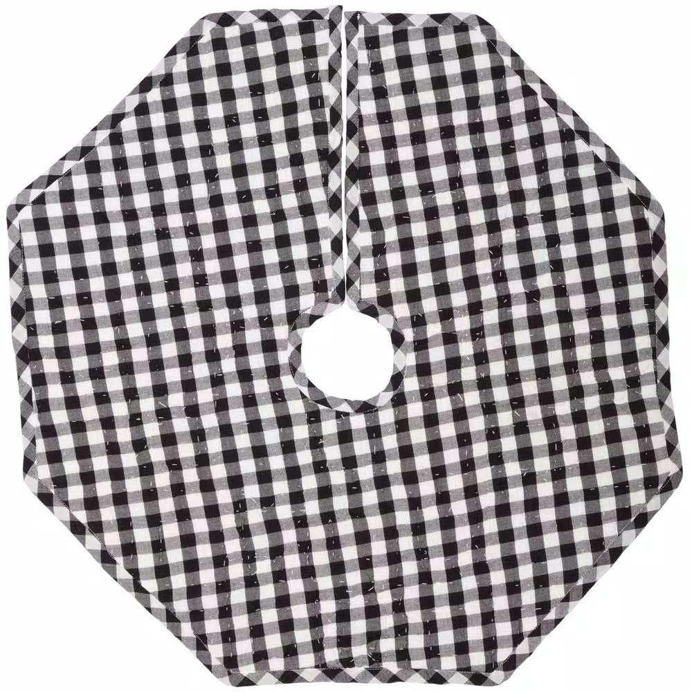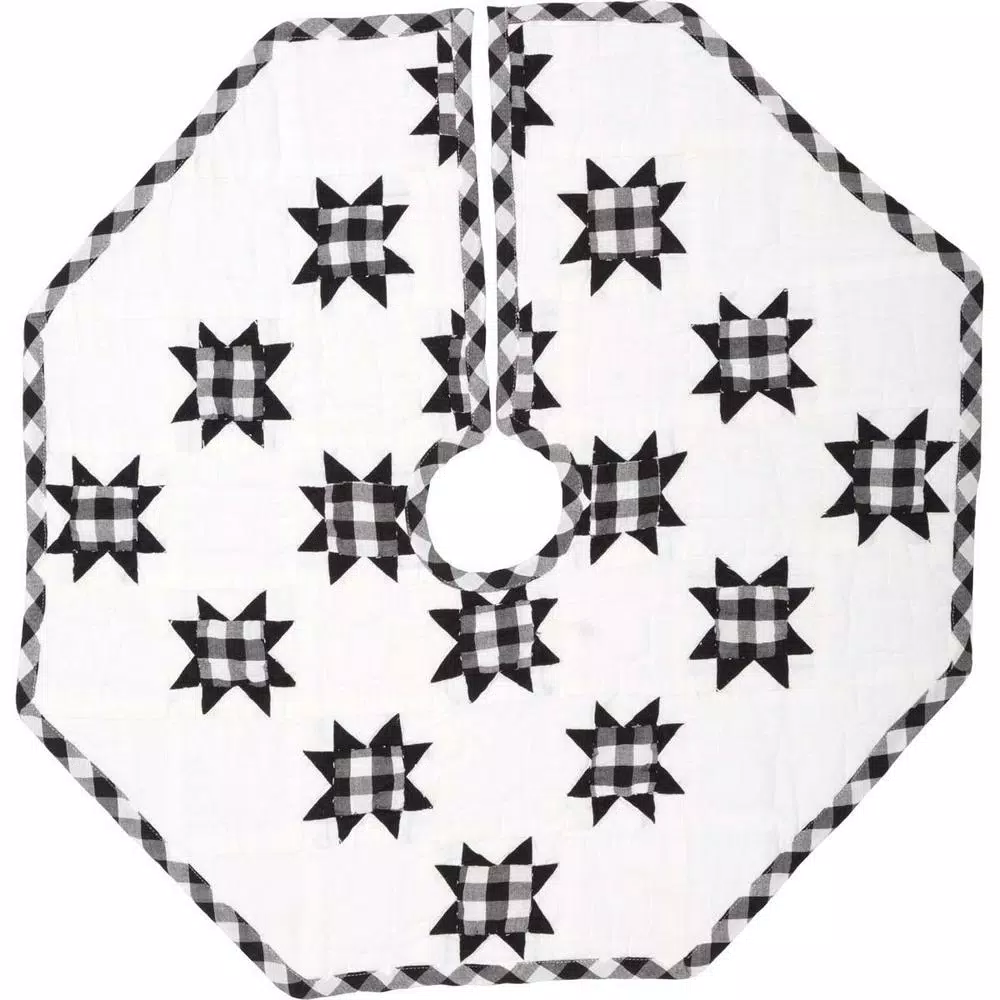 Countrify your Christmas this year with the Emmie Patchwork Tree Skirt. A holiday significant 7 rows of 8-point stars are placed on a bright white background. Reverses to the check found inside the stars. 100% cotton, hand-quilted.